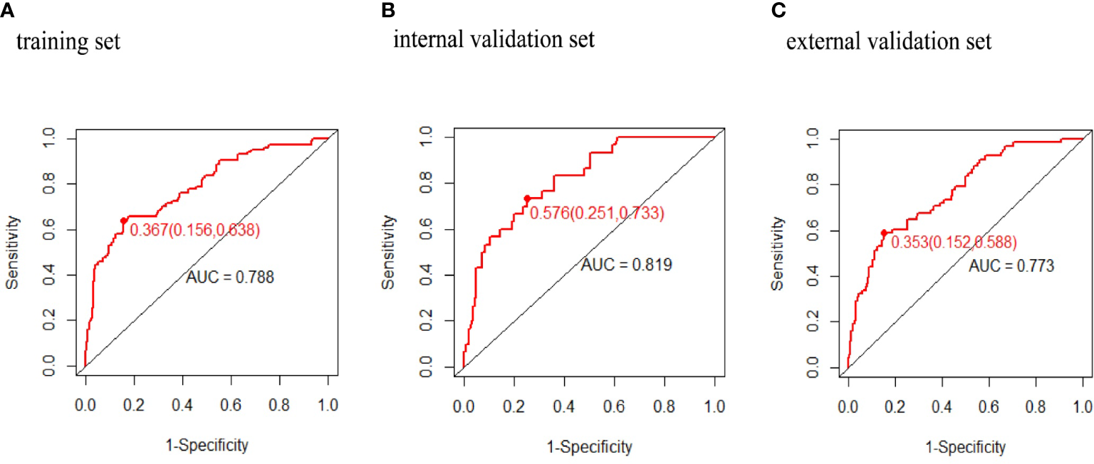 Receiver operating characteristic curves of macrosomia risk nomogram prediction. Receiver operating characteristic curve (ROC) of the (A) training set, (B) internal validation set, (C) external validation set. AUC, area under the receiver operating characteristic curve.