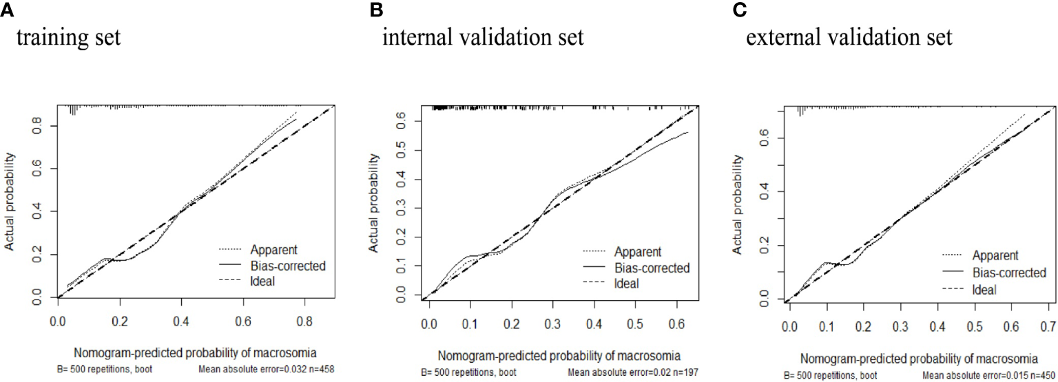 Calibration plots of macrosomia risk nomogram prediction. The x-axis represents the predicted risk of macrosomia. The y-axis represents the actual diagnosed case of macrosomia. The diagonal dotted line represents a perfect prediction by an ideal model. The solid line represents the performance of the (A) training set, (B) internal validation set, (C) external validation set. The closer fit of solid line to the diagonal dotted line represents a better prediction.