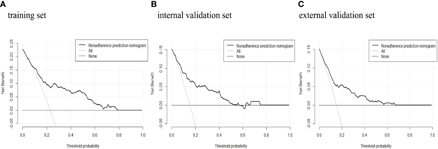 The predictive power was assessed by using the area under the ROC curves (AUC). The AUCs were 0.788 (training set), 0.819 (internal validation set), and 0.778 (external validation set) separately. The optimal cutoffs were 0.367 (training set), 0.576 (internal validation set), and 0.353 (external validation set) (see Figure 4). The C-indices were 0.788 (95% CI 0.736, 0.840), 0.819 (95% CI 0.744, 0.894), and 0.773 (95% CI 0.713, 0.833), respectively. The calibration plots of all three sets fit well with the ideal curves (see Figure 5). The Hosmer–Lemeshow test revealed that the predicted and actual probabilities were consistent (Ptraining set = 0.083, Pinternal validation set = 0.762, Pexternal validation set = 0.074). We then used DCA to assess clinical utility (See Figure 6). The threshold probabilities of the model for the three sets were 3%–78%, 1%–57%, and 2%–66% respectively. As the incidence rate of macrosomia is reported to be 5.47%–31.3% in China (18, 19) and 8.07%–8.84% in other countries in literatures (20), DCA exhibited positive net benefits and potential clinical utility within these thresholds’ ranges (see Figure 6).
