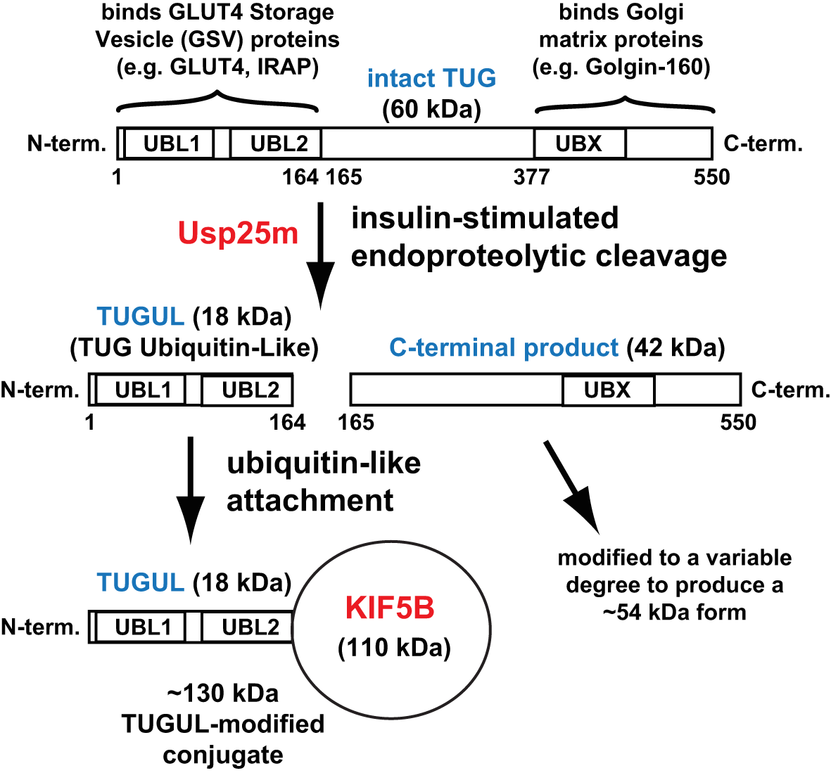 Ubiquitin-like proteolytic processing of TUG. Intact TUG protein is 60 kDa and has the domain structure that is shown. UBL1 and UBL2 are ubiquitin-like domains and UBX is a ubiquitin-regulatory X domain. The residues in the protein are numbered, as indicated, according to the mouse sequence. The N-terminal region binds GLUT4 Storage Vesicle (GSV) proteins, and the C-terminal region binds Golgi matrix proteins, as indicated. In fat and muscle cells, insulin stimulates endoproteolytic cleavage of intact TUG at the bond linking residues 164 and 165. Cleavage is mediated by the Usp25m protease and produces TUGUL (TUG Ubiquitin-Like), an 18 kDa ubiquitin-like protein modifier. The C-terminal product is 42 kDa and it is modified to a 54 kDa form to a variable degree. This modification is not understood. In 3T3-L1 adipocytes, TUGUL is covalently attached to a single target protein, the 110 kDa KIF5B kinesin motor, to produce a 130 kDa conjugate. In muscle, the TUGUL-modified (“tugulated”) protein has not been identified, and it is hypothesized that it is KIF5B or another kinesin motor. TUG cleavage liberates the GLUT4 storage vesicles from the Golgi matrix, and tugulation of the kinesin causes the movement of these vesicles toward the cell surface on these microtubule motors. The figure is modified from Habtemichael EN, et al., (11).
