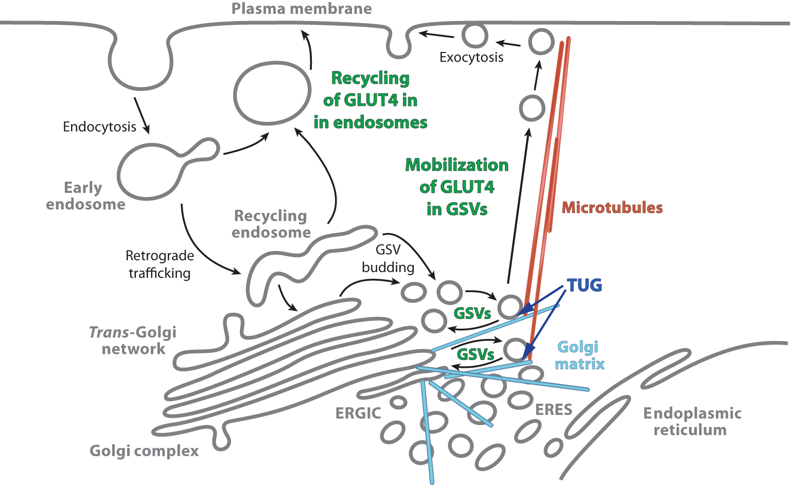 Actions by which insulin stimulation causes increased plasma membrane GLUT4. Insulin stimulates the mobilization of GLUT4 Storage Vesicles (GSVs), and also redirects endocytosed GLUT4 so that it returns directly to the plasma membrane from endosomes. In unstimulated cells, most GLUT4 accumulates in GSVs. These vesicles are trapped at the Golgi matrix by the action of intact TUG with other proteins, and they may participate in a cycle involving internal membranes (as described in the text). Insulin stimulates the acute proteolytic processing of TUG to mobilize the GSVs on microtubule motors directed toward the cell surface. The GSVs fuse at the plasma membrane, and the liberated GLUT4 is then able to populate the endosomal system. During ongoing insulin exposure, recycling of GLUT4 in endosomes becomes a significant source of GLUT4 arriving at the plasma membrane. The model that is depicted is based primarily on studies in adipocytes; data suggest that it holds in muscle as well. In skeletal muscle, data from TUG knockout mice imply that other sites at which insulin modulates GLUT4 trafficking are less important for its overall distribution at the cell surface. ERGIC, Endoplasmic Reticulum–Golgi Intermediate Compartment; ERES, Endoplasmic Reticulum Exit Sites. The figure is modified from Bogan JS, (1).