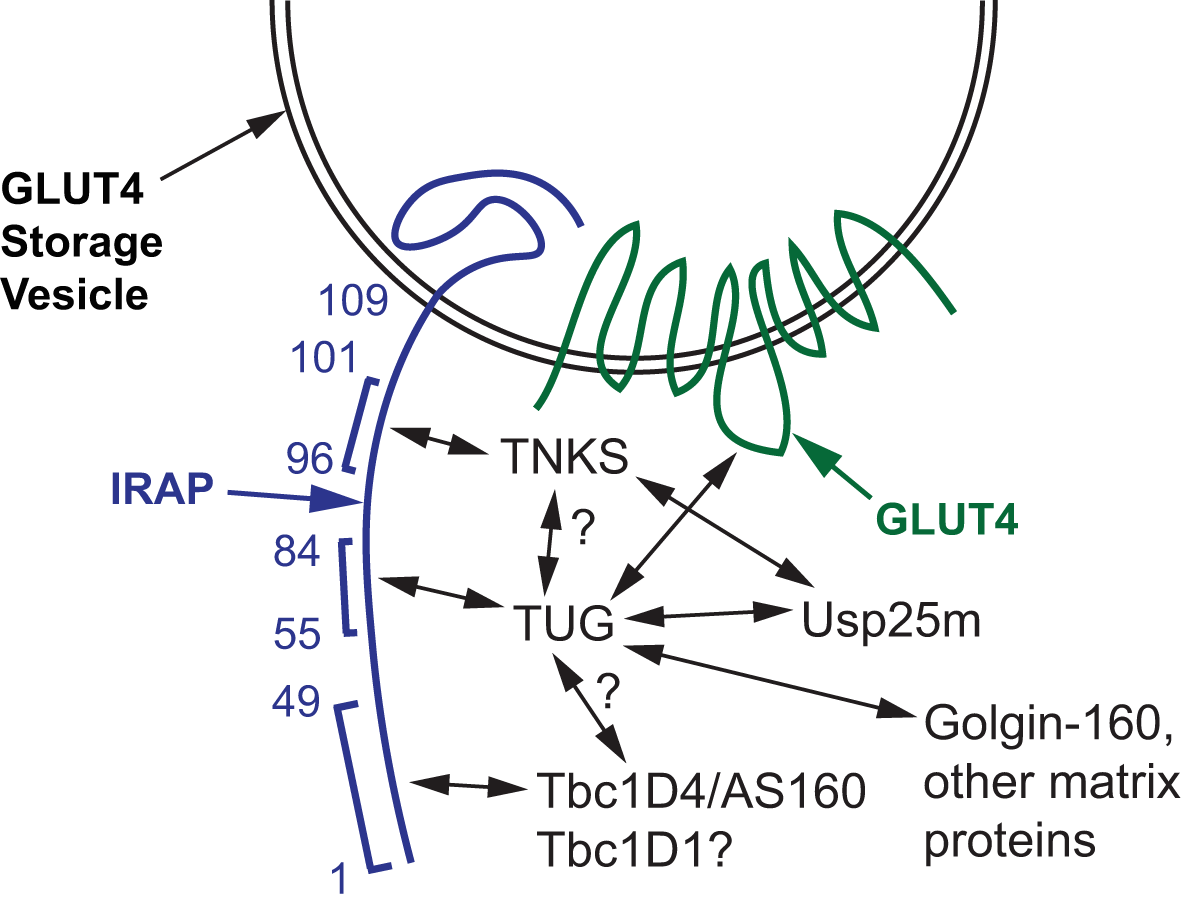 Proteins that bind and regulate GLUT4 Storage Vesicles (GSVs). A GSV membrane containing IRAP and GLUT4 is shown, and amino acid residues in the cytosolic N-terminus of IRAP are numbered. Tankyrase (TNKS), TUG, and Tbc1D4 (AS160) bind to adjacent peptides in IRAP, as indicated by brackets. TUG also binds the large intracellular loop of GLUT4, and both TUG and TNKS bind Usp25m. Direct binding of TUG to TNKS and to Tbc1D4 has not been shown; these hypothesized interactions are indicated with question marks. Tbc1D1 binds the cytosolic domain of IRAP (residues 1-109), but this interaction has not been localized further; the question mark indicates that it is hypothesized to bind IRAP residues 1-49 similar to Tbc1D4. TUG binds to Golgin-160 and other Golgi matrix proteins through its C-terminus, which is required to trap the vesicles intracellularly in the absence of insulin stimulation.