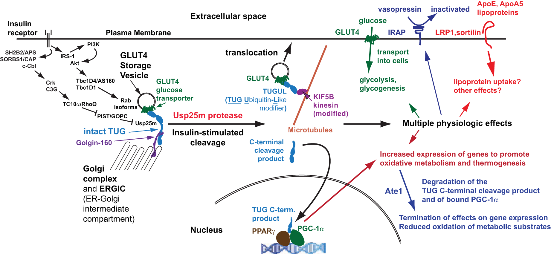 Coordinated regulation of distinct physiologic effects. Insulin signals through at least two signaling cascades to mobilize GLUT4 storage vesicles (GSVs). One involves Akt and the RabGAPs, Tbc1D4 and Tbc1D1, which regulate distinct Rab proteins on the GSVs (and on other membranes, such as endosomes). A second pathway involves the Rho family GTPase TC10α, which is coupled through its effector PIST to the TUG protease, Usp25m. Insulin stimulates TUG endoproteolytic cleavage to liberate the GSVs from Golgi matrix proteins, including Golgin-160 and others not shown. The N-terminal cleavage product, TUGUL, is a ubiquitin-like modifier. In adipocytes, TUGUL is attached to KIF5B, a microtubule motor that carries the GSVs to the cell surface; in muscle, this or another kinesin may be involved. Fusion of these vesicles at the cell surface results in the insertion of their specific cargo proteins into the plasma membrane. These include GLUT4, which promotes glucose uptake, IRAP which cleaves and inactivates circulating vasopressin, and LRP1 and sortilin, which bind the lipoproteins ApoE and ApoA5 and may regulate lipid metabolism. These proteins may have other effects as well. The TUG C-terminal product is extracted from the Golgi matrix by the action of p97 ATPases and is targeted to the nucleus. It binds the transcriptional regulator PPARγ and its co-factor PGC-1α, and stimulates the expression of genes to promote lipid oxidation and thermogenesis. The stability of the C-terminal product is regulated by the Ate1 arginyltransferase, and the product confers Ate1-dependent stability on PGC-1α. Degradation of these proteins makes their thermogenic effect transient, consistent with the transient increase in thermogenesis that is observed after meals.
