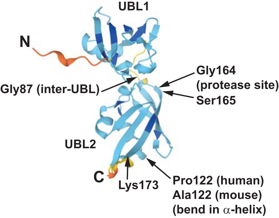 The structure of mouse TUGUL as predicted by AlphaFold is shown (accession Q8VBT9). The two ubiquitin-like domains, UBL1 and UBL2, are linked by a short peptide including the Gly87 residue. In both the mouse and human predicted structures, the main α-helix in UBL2 has a bend at residue 122, corresponding to Pro122 in humans and Ala122 in mice. The β-sheet that wraps around this helix has an extended central strand, extending to Lys173 in the predicted structure as shown. Data indicate that the scissile bond is that joining Gly164 and Ser165, which is near the beginning of this strand. This unusual structure may help to confer the cell type -specificity of TUG cleavage, which occurs primarily in fat and muscle cells. See text for details.