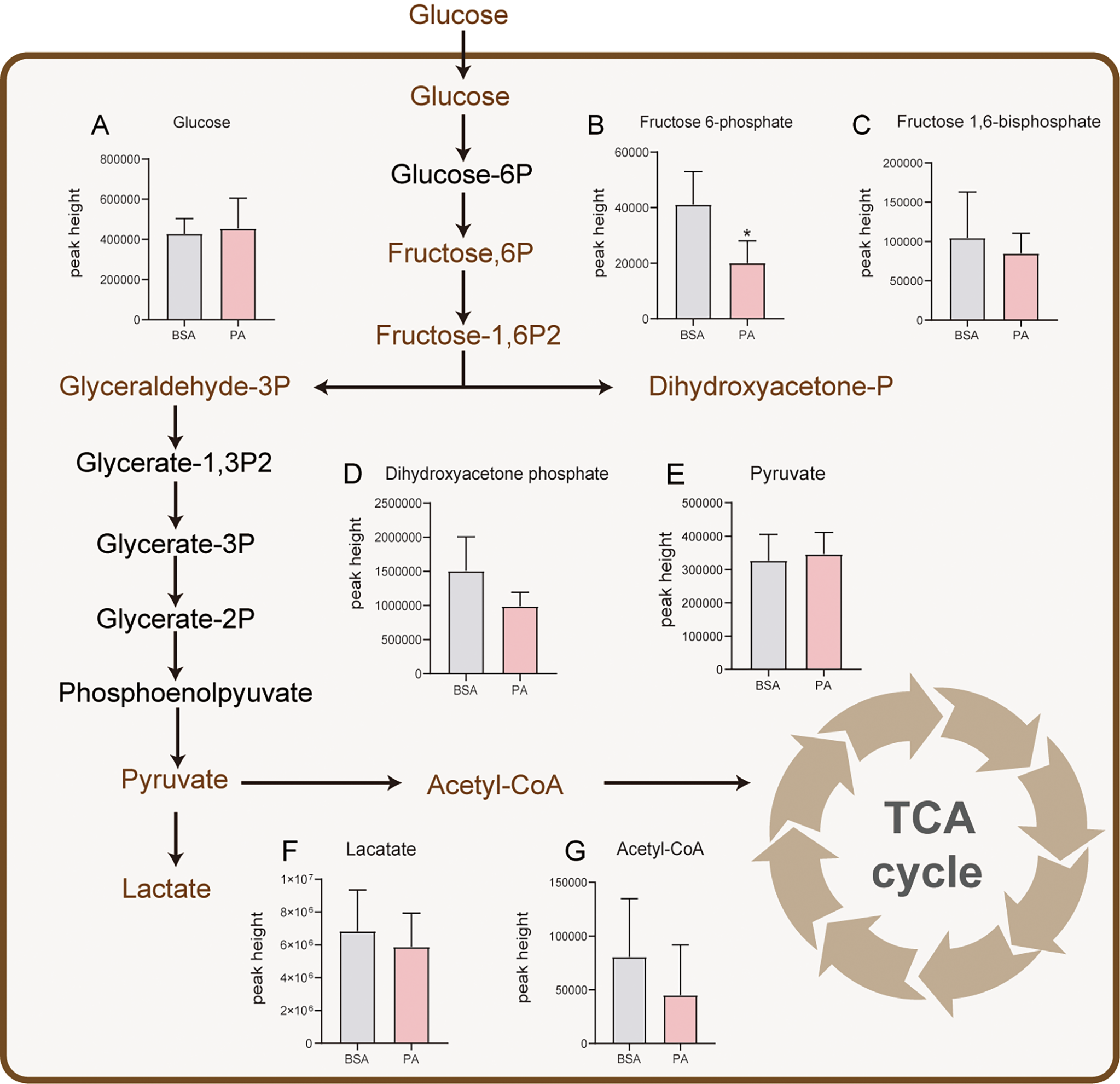 Effect of PA on glucose and lactate metabolism of SCs. After glucose is taken up by SCs, pyruvate is produced through glycolysis. Most of the pyruvate is used to produce and secrete lactate for GCs to provide energy, and only a small part of pyruvate participates in the TCA cycle. Levels of glucose (A), fructose-6-phosphate (B), fructose-1,6-bisphosphate (C), dihydroxyacetone phosphate (D), pyruvate (E), lactate (F), and acetyl-CoA (G). The metabolites marked in brown were detected by metabolomics analysis. The red columns represent the PA group, and the grey columns represent the BSA group. Data were expressed as mean ± SD, *p < 0.05.