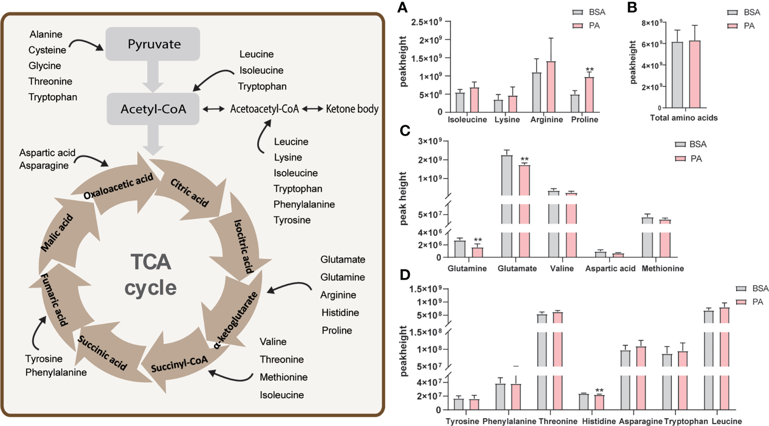 Effect of PA on amino acid metabolism of SCs. The schematic diagram of amino acids participating in the TCA cycle is shown on the left. Amino acids enter the TCA cycle through conversion into different substances. Peak height of amino acids that participate in the TCA cycle (A, C, D) and the total amount of these amino acids (B). Data were expressed as mean ± SD, **p < 0.01.