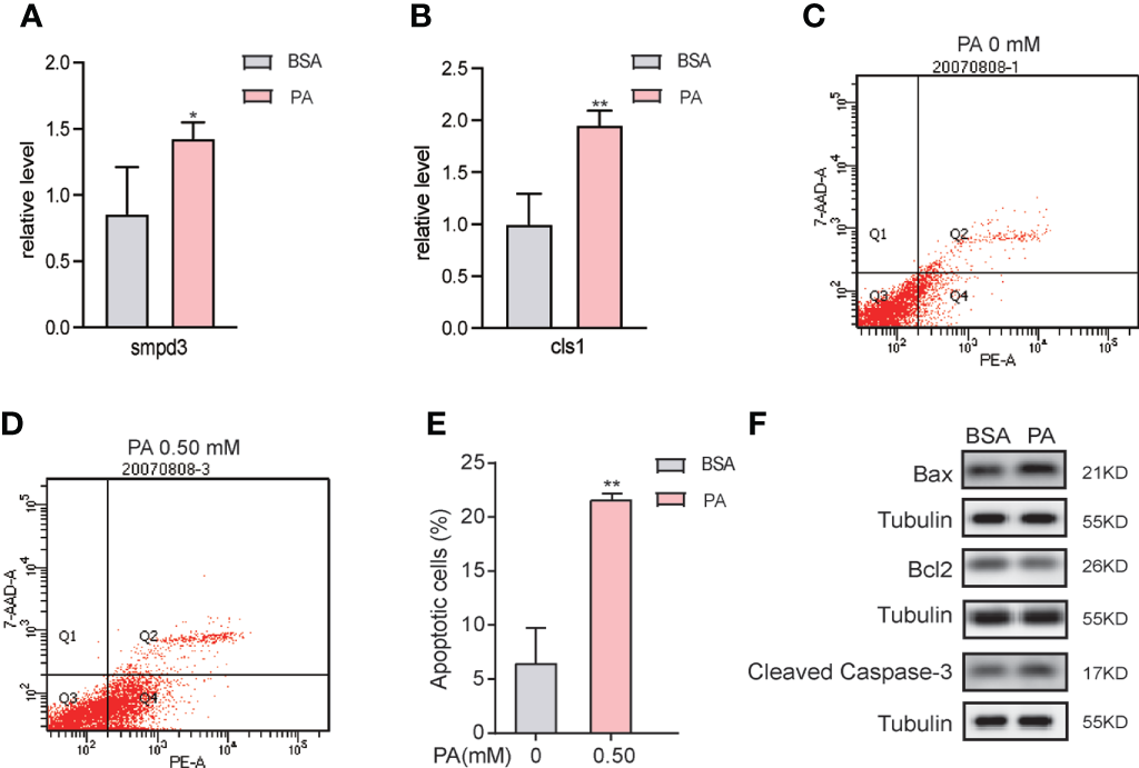 PA overload promotes apoptosis in SCs. (A, B) mRNA expression levels of smpd3 and cls1 in PA-treated SCs. (C–E) After PA treatment at concentrations of 0 mM and 0.5 mM for 24 h, the apoptosis rate of SCs was detected by flow cytometry (FCM). (F) Apoptosis-related protein expression in PA-treated SCs. 7-AAD, 7-aminoactinomyosin D. Data were expressed as mean ± SD, *p < 0.05, **p < 0.01.