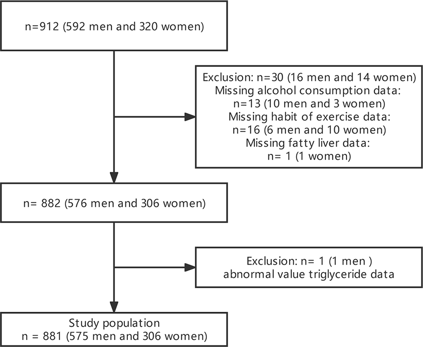 Between March 2004 and December 2012, 1,445 participants in the Murakami Memorial Hospital health check-up program had their medical records with clinical features examined. This study comprised 912 participants (592 men and 320 women). The detailed process of inclusion and exclusion was as described in the previous work of Fukuda et al. (21). After the direct deletion of 30 missing values for alcohol consumption, exercise, and fatty liver, as well as 1 abnormal TG, 881 participants were finally used for analyses. The flowchart for participant selection is presented in Figure 1.