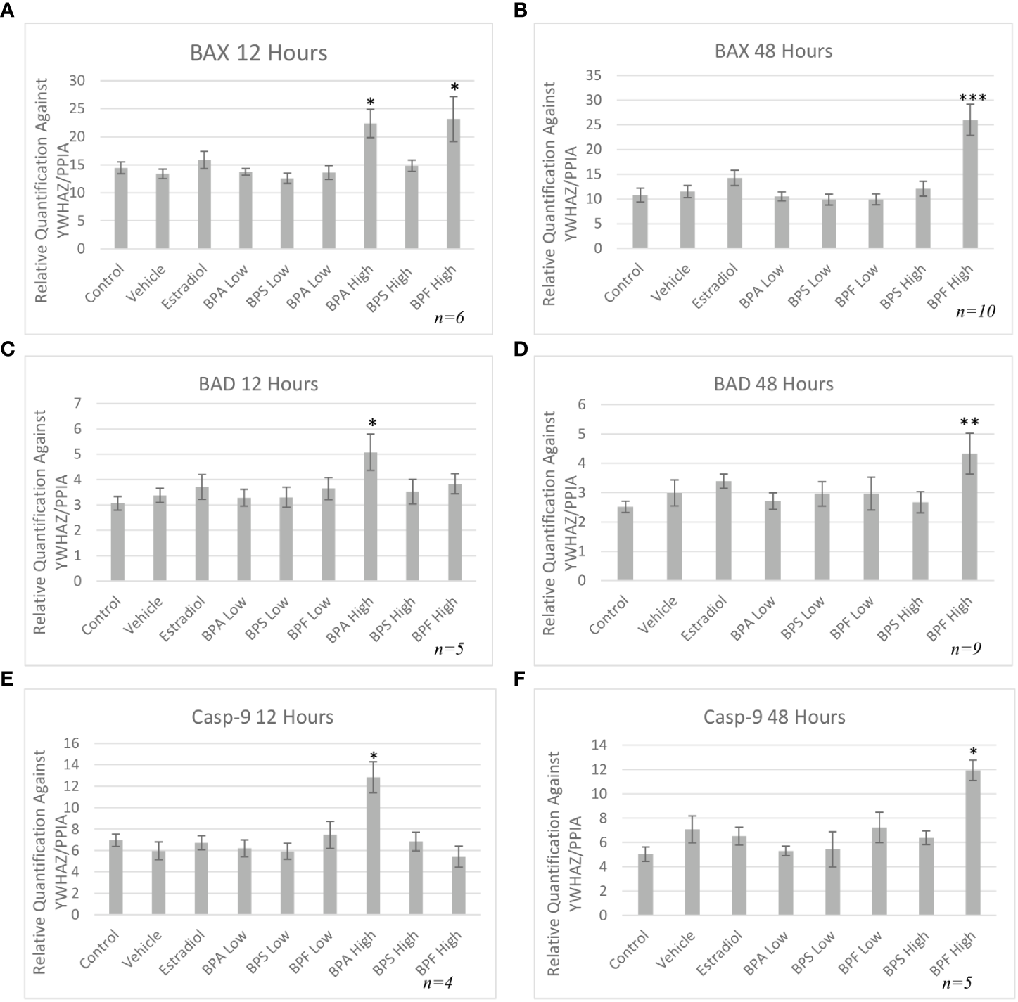 Pro-apoptotic mRNA expression after treatment with bisphenols. BAX 12 (A) and 48 (B) hours, BAD 12 (C) and 48 (D) hours, and Casp-9 12 (E) and 48 hours (F) mRNA in granulosa cells after treatment at a low (0.5 μg/mL) and high (50 μg/mL) dose of BPA, BPS, and BPF. Quantification relative to reference genes YWHAZ and PPIA. *p < 0.05,**p<0.01, and ***p<0.001 compared to controls was considered as statistically significant. Error bars represent +/- SEM.