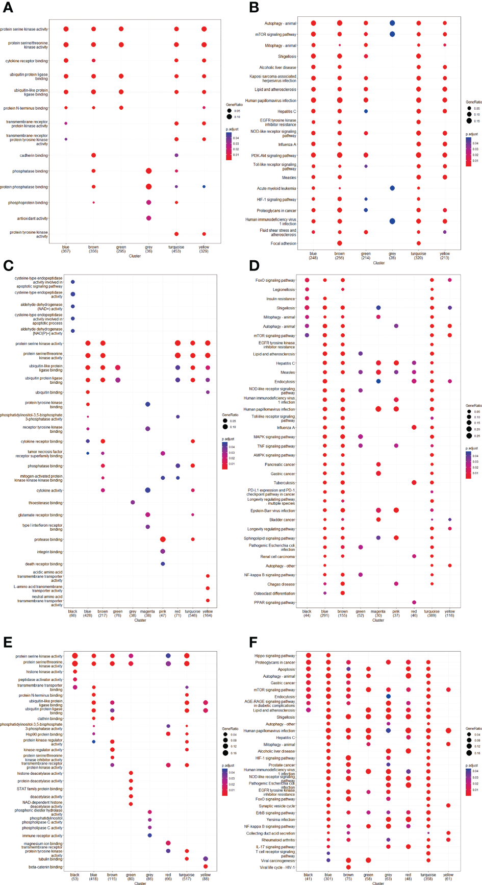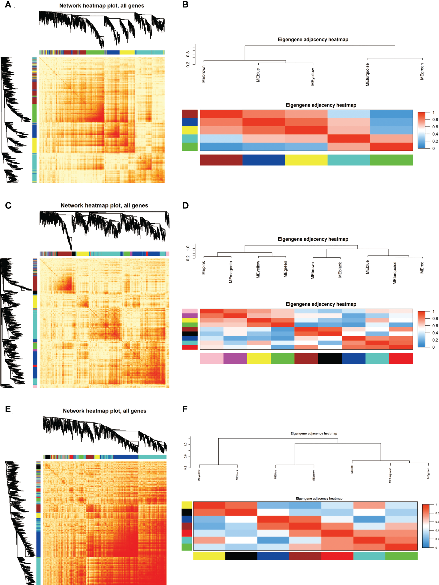 Based on the co-expressed genes, the heatmap indicated that ATGs in the same module tend to have a high biological significance (Figures 2A, C, E). The eigengene dendrogram and heatmap were used to identify groups of correlated eigengenes in modules (Figures 2B, D, F). The blue color represents low adjacency (negative correlation), while the red represents high adjacency (positive correlation).