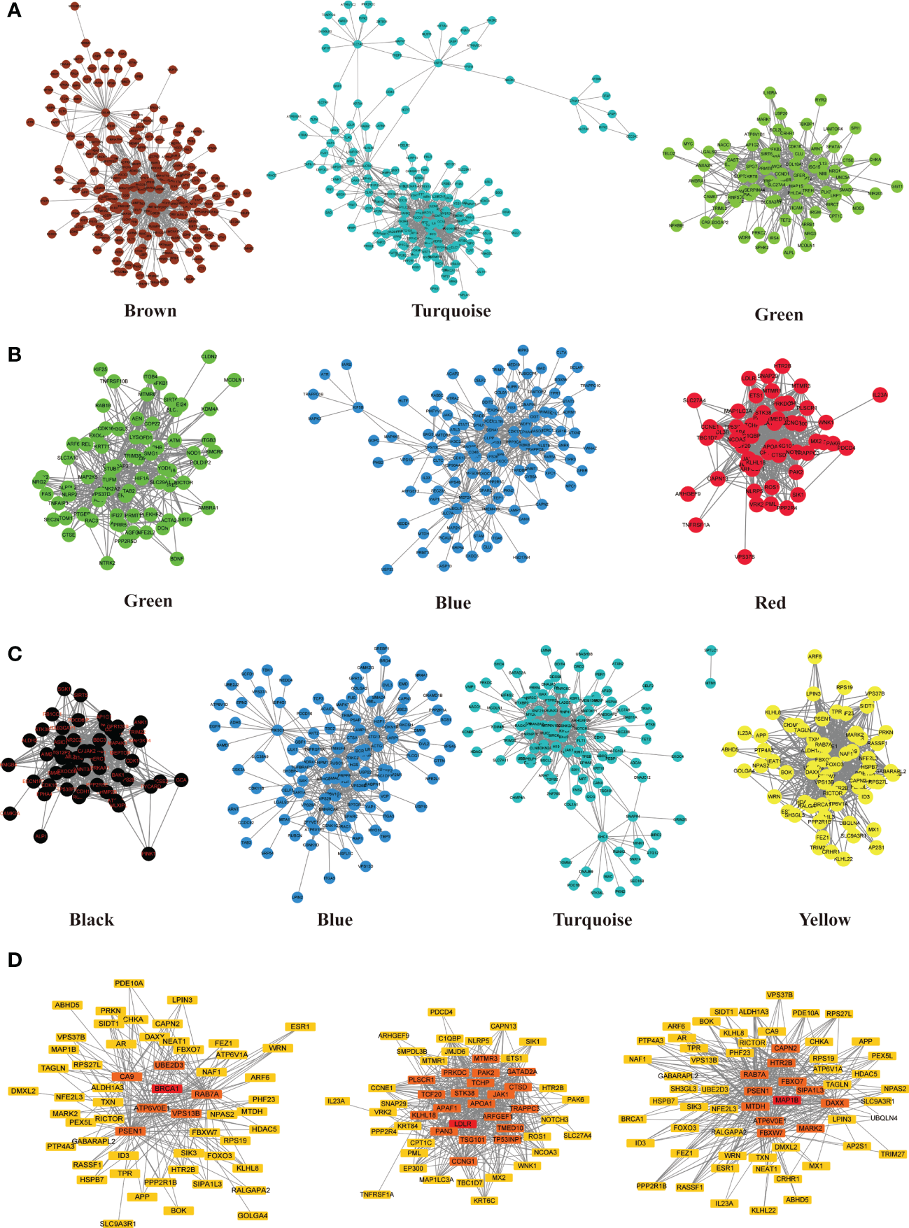 Co-expression network of PCOS-autophagy-related modules and core ATGs visualized by Cytoscape. (A–C) Sub-networks of key modules in GSE8157 (A), GSE43264 (B) and GSE106724 (C). Module networks extracted from WGCNA. The nodes represent genes. The interaction between each node was evaluated by adding an edge between them. The node’s color is in accordance with the color of the key modules. (D) Network analysis with the most correlations identified hub ATGs. The color scale of yellow to Red indicates differences in correlations. The closer the color to Red, the stronger the correlation.