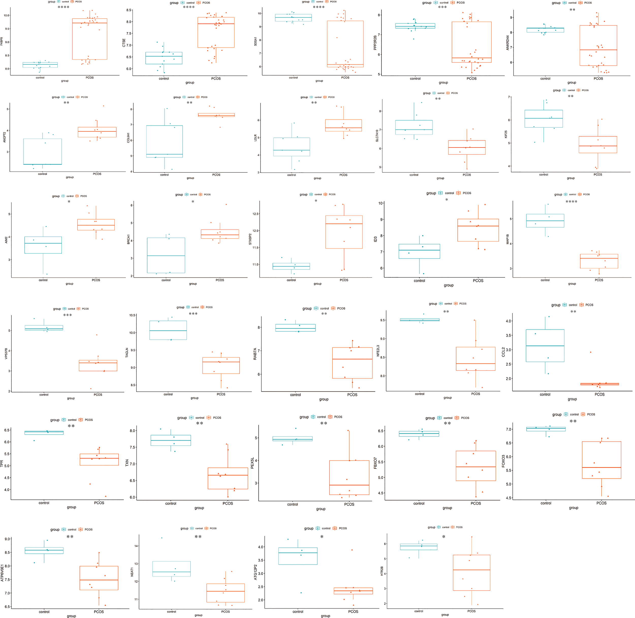 Differential expression of hub ATGs. The box plots showed the differential expression of hub ATGs between women with and without PCOS in GSE51981, GSE43264, and GSE106724. p<0.05 was considered statistically significant. ****: p < 0.0001, ***: p < 0.001, **: p < 0.01, *: p < 0.05.