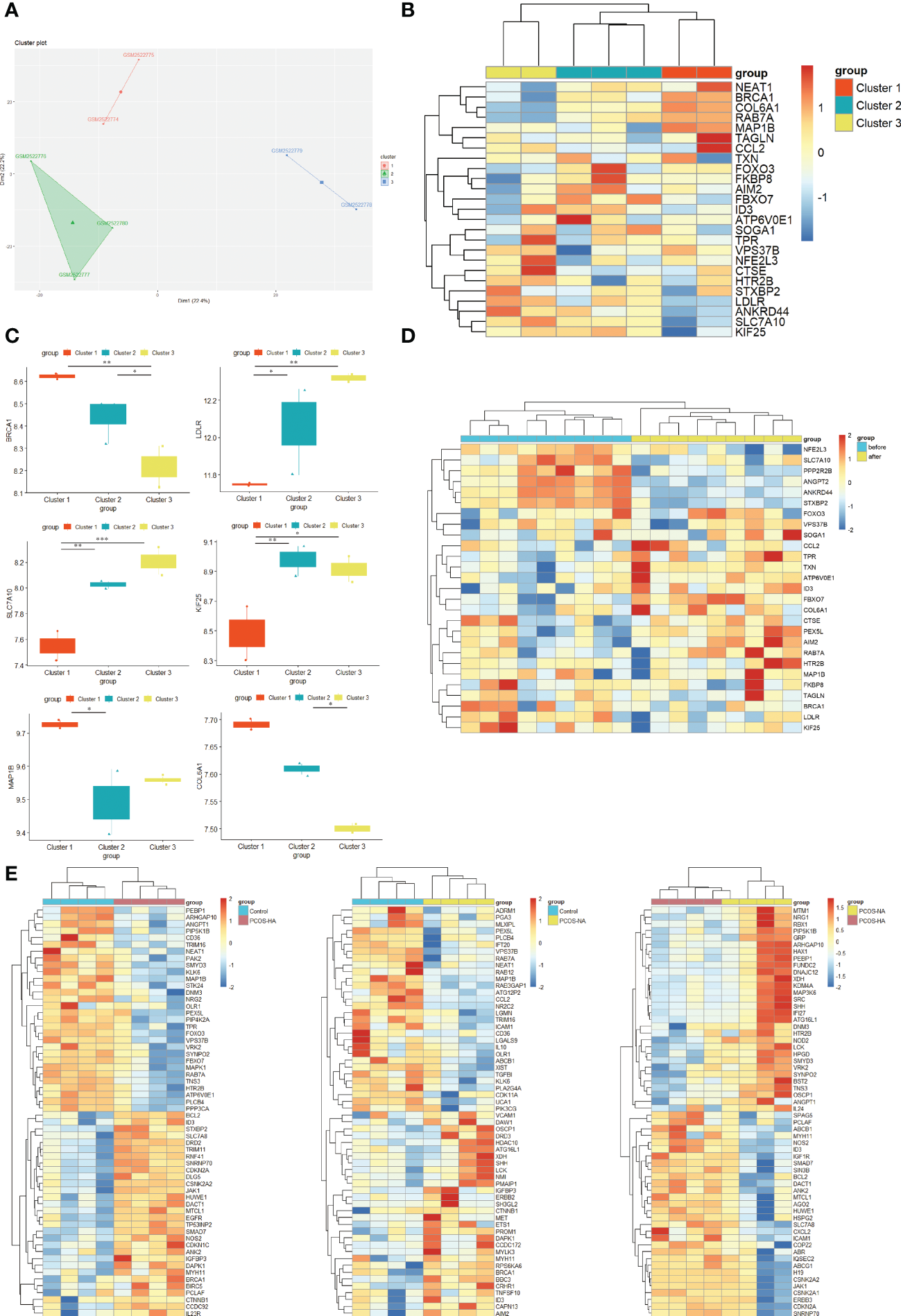New autophagy-related molecular subgroups in PCOS. (A) K-means clustering based on GSE95728. K-means clustering based on SSE to realize the selection of K value (K=3). Tsne diagram shows the clustering of women with PCOS. (B) Heatmap showing the expression of 29 co-expressed hub ATGs in PCOS new molecular subgroups. The columns represent 3 subgroups for patients with PCOS (red, blue and yellow columns). The color represents the expression value (log2(exp+1)). Red rows indicate up-regulation, whereas blue rows indicate down-regulation. The darker the color, the greater the difference. (C) The expression of hub ATGs in different clusters. Box plot showing the mRNA expression of hub ATGs genes in three clusters. p<0.05 was considered statistically significant. **: p < 0.01, *: p < 0.05. (D) Heatmap showing the expression of the ATGs in PCOS insulin sensitizer treatment groups. The columns represent patients with PCOS before (blue columns) and after pioglitazone treatment (yellow columns). The color represents the expression value (log2(exp+1)). Red rows indicate up-regulation, whereas blue rows indicate down-regulation. The darker the color, the greater the difference. (E) Heatmap showing the expression of the ATGs in PCOS-androgen-related subgroups. The columns represent healthy controls (blue columns), PCOS patients with NA(Normal androgen) (yellow columns),and HA(Hyperandrogenism) (red columns). Red rows indicate up-regulation, whereas blue rows indicate down-regulation. The darker the color, the greater the difference.
