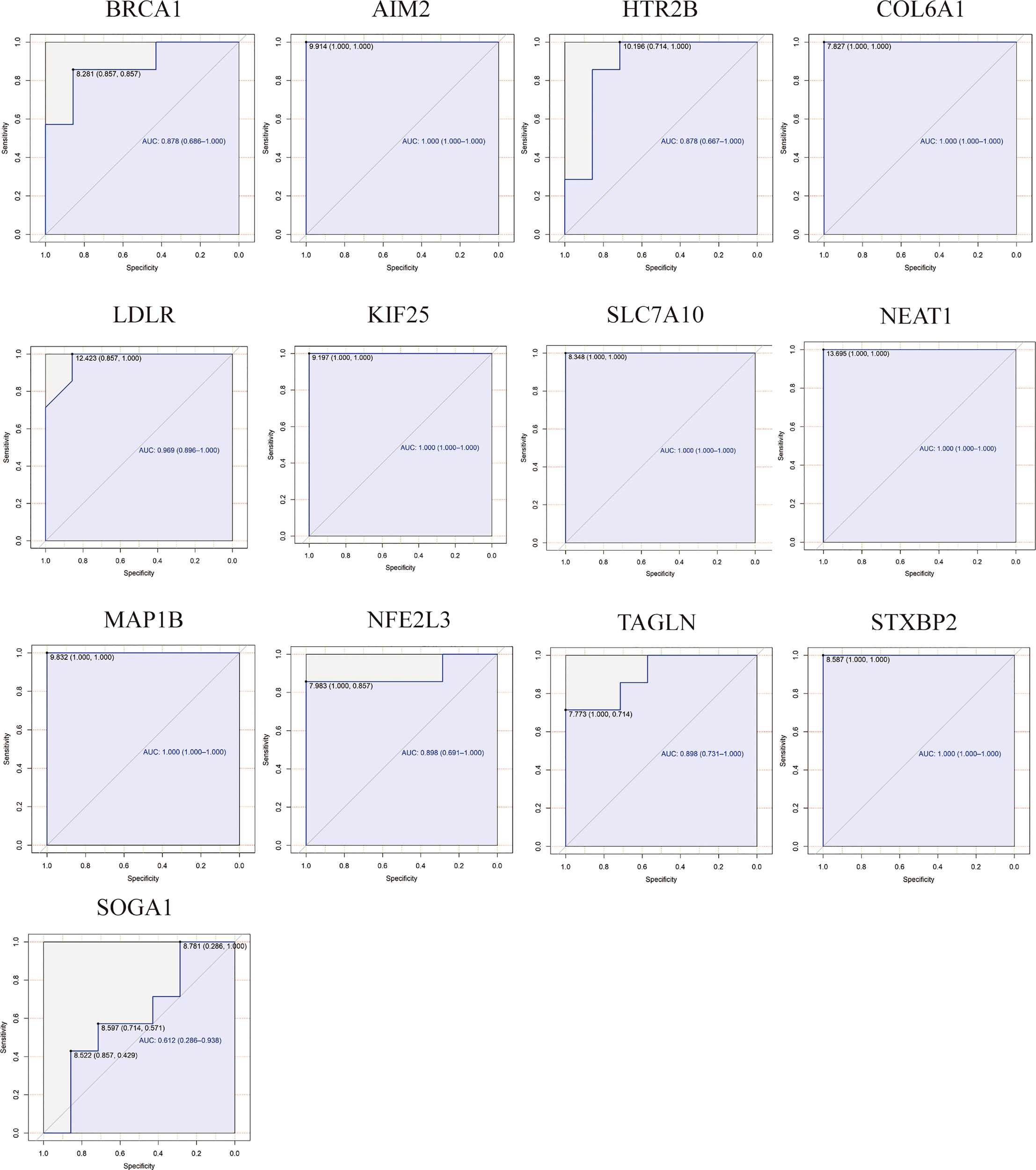 The ROC analysis was employed to evaluate the specificity and sensitivity of the hub ATGs for the diagnosis of PCOS (Figure 7). GSE95728 showed AUC values exceeding 60% considered to be acceptable, for 12 hub ATGs. For AIM2, COL6A1, LDLR, KIF25, SLC7A10, NEAT1, MAP1B, and STXBP2, AUC values exceeded 90%, indicating higher sensitivity and specificity.