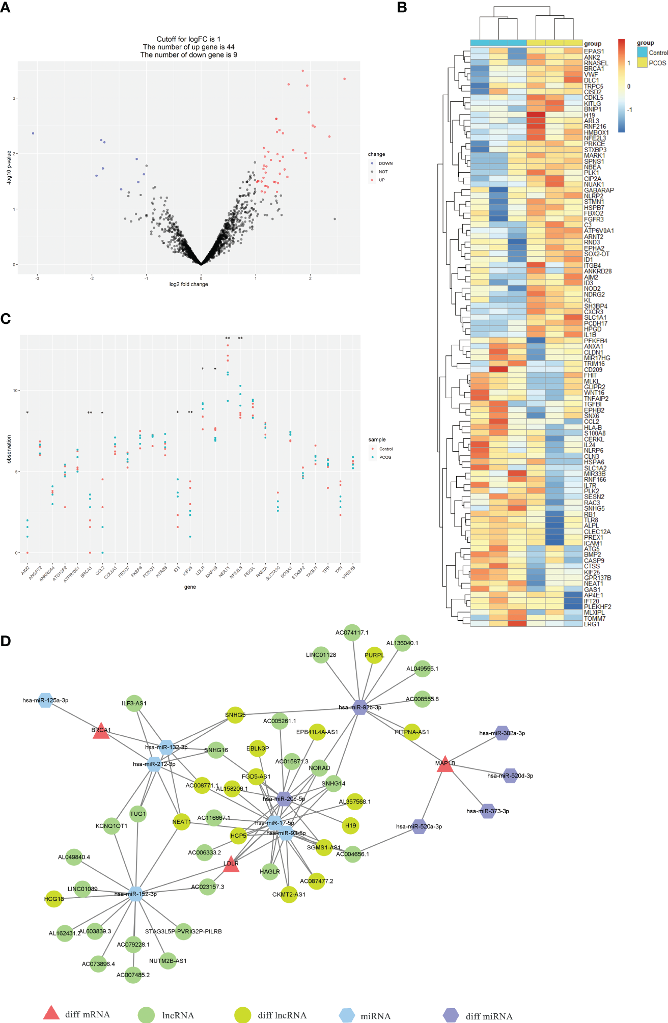 Expression profiles of ATGs by RNA-seq and construction of the multifactorial PCOS-autophagy-related network. (A) Volcano plots visualized RNA-seq results showing differential expression ATGs. The differences between the groups are plotted on the X-axis. The log10(p-value) for the differences is plotted on the Y-axis. (B) Heatmap showing the differential expression ATGs by RNA-seq. The columns represent healthy controls (blue columns) and PCOS patients(yellow columns). Red rows indicate up-regulation, whereas blue rows indicate down-regulation. The darker the color, the greater the difference. (C) Scatter plot showing the expression of hub ATGs via RNA-seq between healthy controls (red node) and PCOS patients (blue node). p<0.05 was considered statistically significant. **: p < 0.01, *: p < 0.05. (D) The mRNA-miRNA-lncRNA multifactorial network visualized by Cytoscape consists of 3 mRNAs (red triangles), 6 miRNAs (blue and purple hexagons), and 16 lncRNAs (green ellipses).