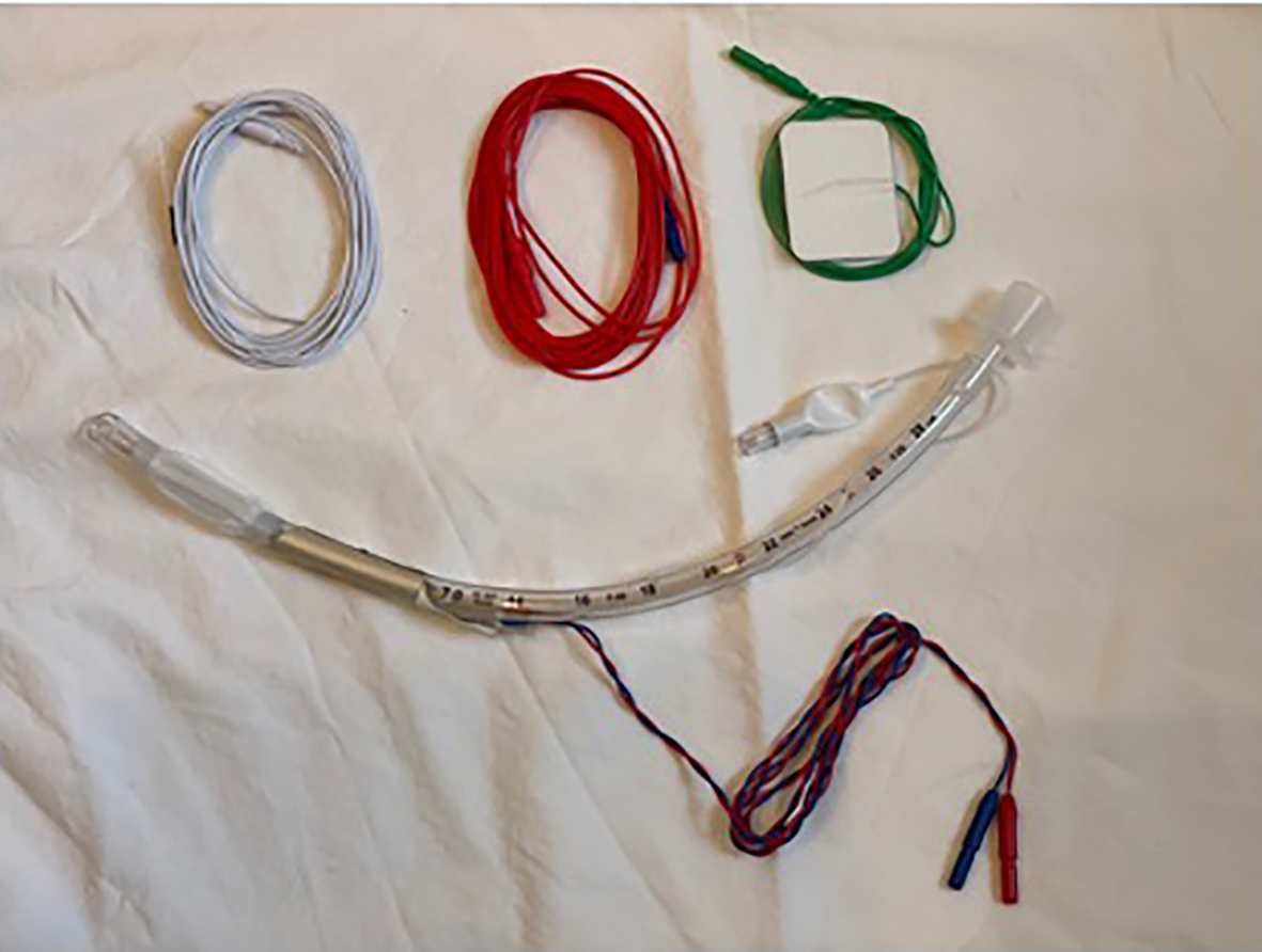 An example of a IONM system. Adhesive electrodes are applied to an endotracheal tube and the blue and red wires are connected to a nerve monitoring system. One needle wire (white) is inserted into the deltoid muscle, a green lead wire sticker is applied to the forehead, and the single red wire connects to a handheld monopolar probe that is used to stimulate the recurrent laryngeal nerve.