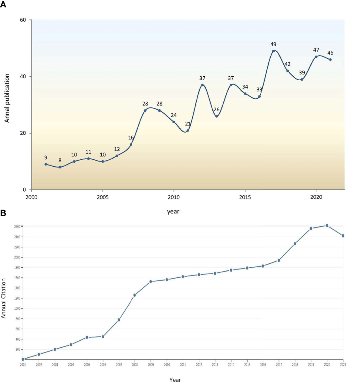 (A) Annual publications of GWAS research in diabetes from 2001 to 2021. (B) Trends in annual citation frequency of the 567 retrieved articles from 2001 to 2021.