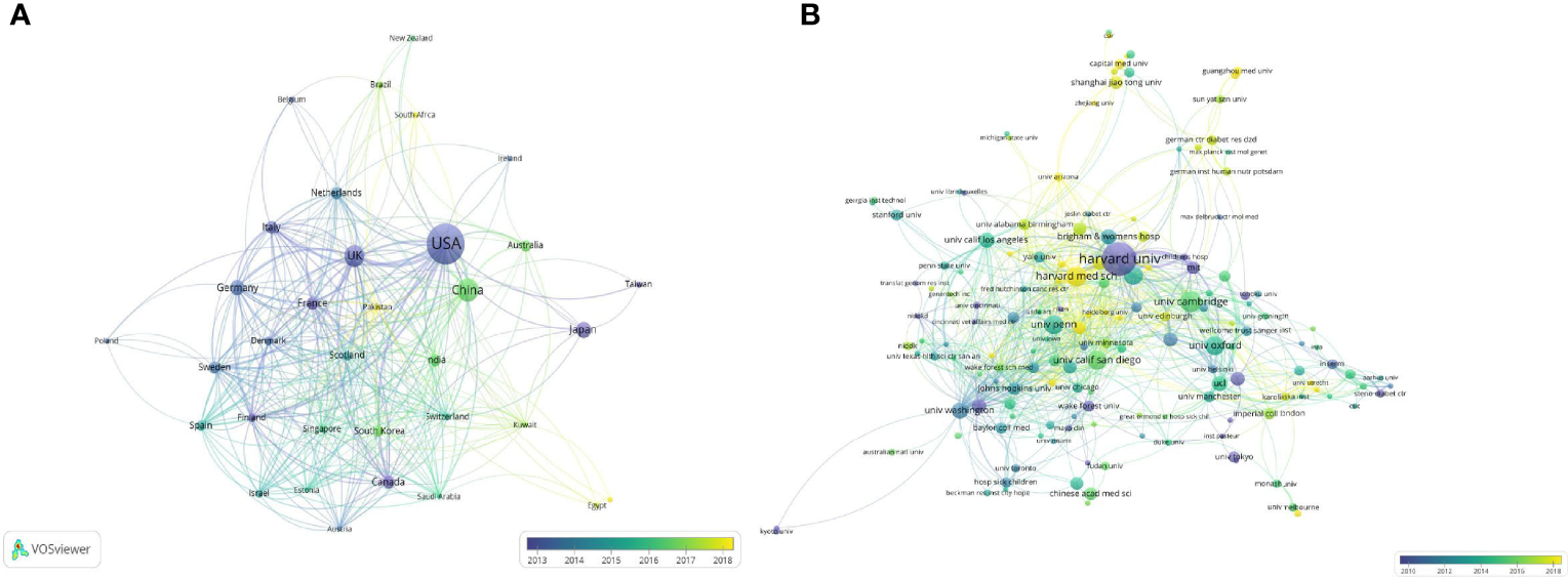 (A) The network of cooperation between countries/regions. (B) The network of cooperation between institutions based on VOSviewer. Node size indicates the number of publications; the link size refers to the cooperation Intensity; the earlier contributions were presented in darker colors.