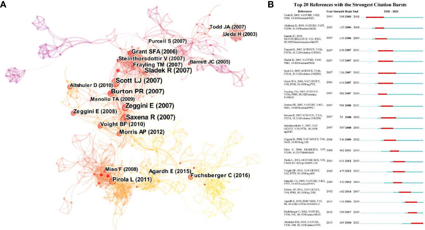 The citation patterns of the references revealed insights into the structure and dynamics of scientific paradigms. Figure 3A provides a visualization of the document co-citation landscape. The synthesized network contained 805 references and 2,257 co-citation links. The three largest connected components included 481 references, accounting for 59% of the entire network. The nodes and links are distinguished by colors, in which a cool-toned color refers to an earlier co-citation relationship. References with ≥10 citations are displayed in the landscape. Meanwhile, we included the citation burst in Figure 3B to identify the major milestones in the development of GWAS in diabetes steering the research trends. The major milestones in the development of GWAS in diabetes could be identified as references with a high burst strength in Figure 3B.