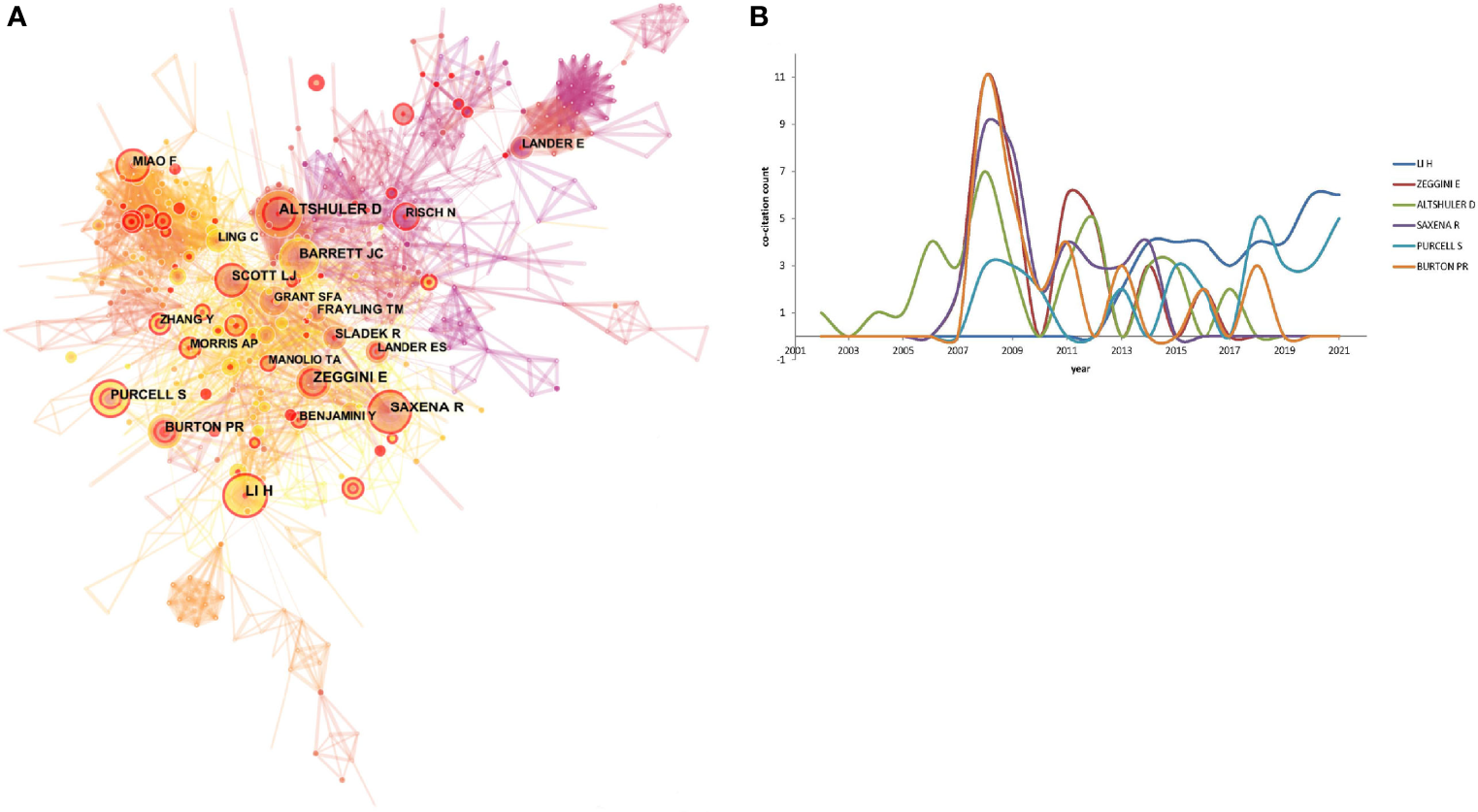 The author co-citation network, identifying frequently cited scholars with globally recognized publications in GWAS in diabetes, was processed by CiteSpace, shown in Figure 4A, achieving a network with 788 nodes and 2,218 links. The top 6 highly cited authors and their citation distributions during 2001–2021 are shown in Figure 4B. H. Li, E. Zeggini, D. Altshuler, R. Saxena, S. Purcell, and P.R. Burton constituted over 30 co-citations assisting the development of GWAS in diabetes in fields ranging from bioinformatics, genetic mapping to the pathophysiology of diabetes and explanations of the phenotypes.