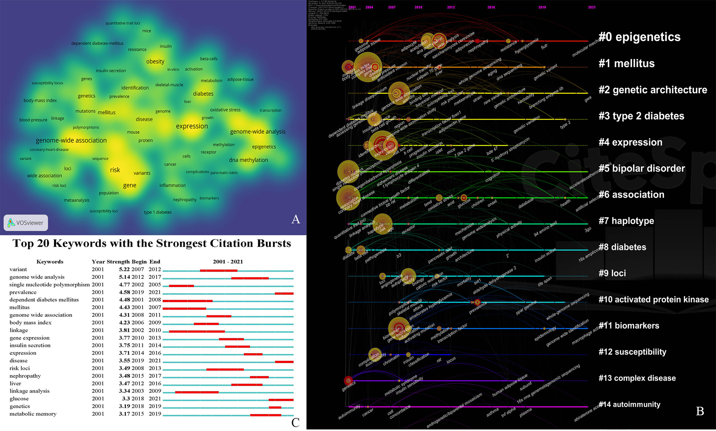Keyword burst analysis revealed the top 20 emergent keywords with the strongest citation bursts, as shown in Figure 5C. The keywords were ranked based on the strength of bursts. Variant (in cluster #4) and genome-wide analysis (in cluster #5) received the highest bursting attention across the entire span. In the early years, investigating the genetic basis of insulin-dependent diabetes mellitus (in cluster #3) was one of the most important goals. Recently, there has been a growing interest in diabetes-related complications, including nephropathy (in cluster #0), and novel mechanisms in the development of the disease, such as metabolic memory (in cluster #0).