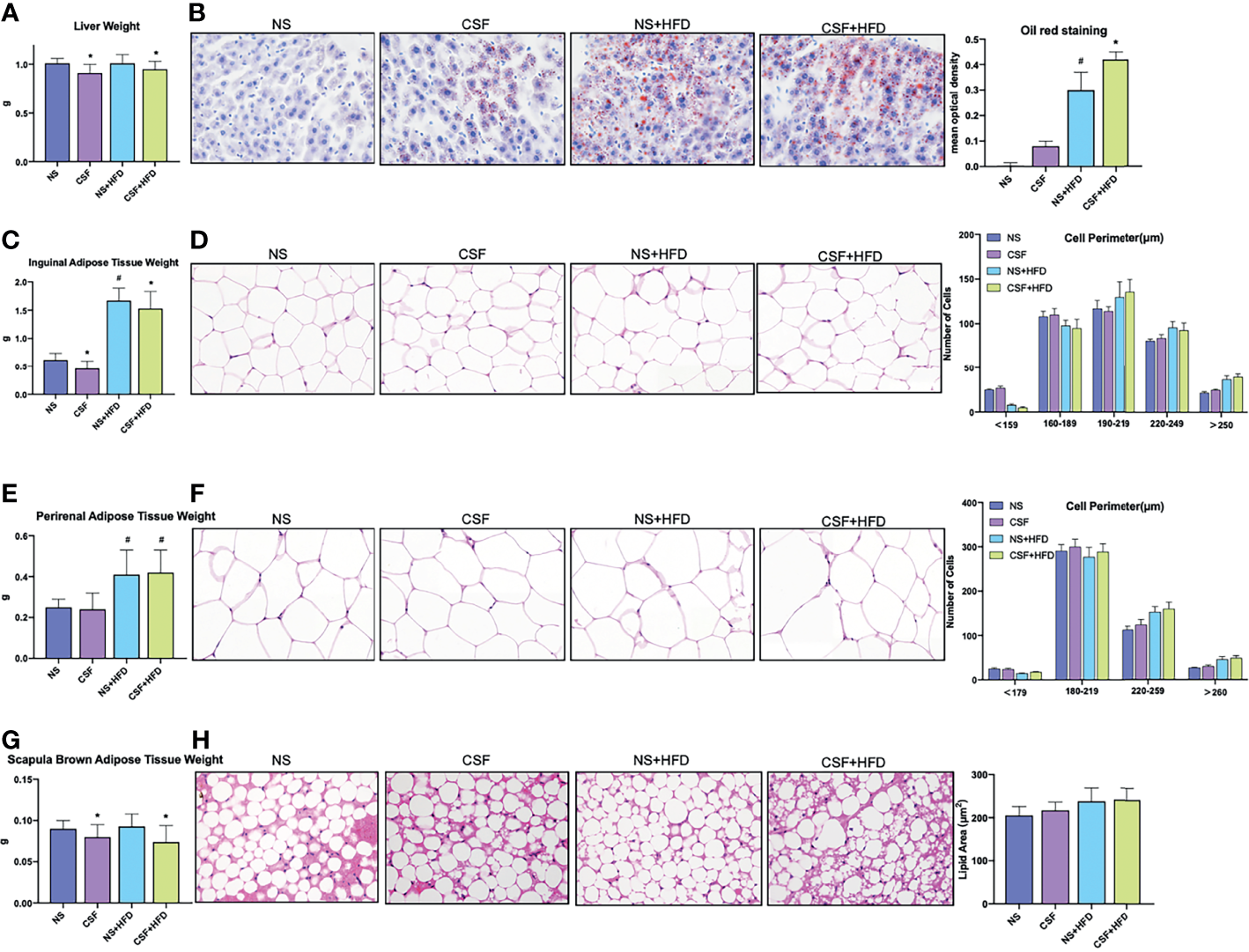 Profiles of liver tissue, abdominal subcutaneous and visceral white adipose tissue, and scapula brown adipose tissue of mice exposed to CSF intervention. (A) Liver weights of the mice in the chow diet and HFD groups pre- and post- CSF. (B) Oil red staining of liver tissue and mean optical density of the mice in the chow diet and HFD groups pre- and post- CSF. (C) Inguinal adipose tissue (Abdominal subcutaneous white adipose tissue) weights of the mice in the normal and HFD groups before and after CSF. (D) Hematoxylin-eosin staining and the distribution of adipocyte perimeters of inguinal adipose tissue of the chow diet-fed and HFD-fed mice before and after CSF. (E) Perirenal adipose tissue (abdominal visceral white adipose tissue) weights of the mice in the chow diet and HFD groups pre- and post- CSF. (F) Hematoxylin-eosin staining and the distribution of adipocyte perimeters of perirenal adipose tissue of the mice and brown fat weight of the chow diet-fed and HFD-fed mice before and after CSF. (G) Scapula brown adipose tissue weights of the mice in the chow diet and HFD groups pre- and post- CSF. (H) Hematoxylin-eosin staining and lipid area of scapula brown adipose tissue of the mice in the chow diet and HFD groups pre- and post- CSF. Data are expressed as mean ± SEM. Group differences were assessed by using the Mann‐Whitney U test. *P < 0.05 when comparing NS and CSF groups (NS group vs CSF group, NS+HFD group vs CSF+HFD group). #P < 0.05 when comparing chow diet and HFD groups (NS group vs NS+HFD group). Original magnification: 400 ×.
