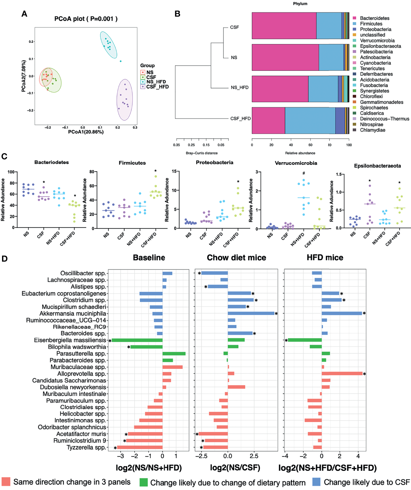 The PCoA plot (Figure 5A) showed that the NS and CSF groups were partially separated along the PC1 axis, whereas the NS+HFD and CSF+HFD groups were fully separated along the PC2 axis. “Stacked clustering” (Figure 5B) of the four groups revealed that CSF exposure slightly altered the microbial composition of chow-fed mice compared to HFD-fed mice. In contrast, the microbial composition was significantly changed after the combined CSF+HFD intervention.