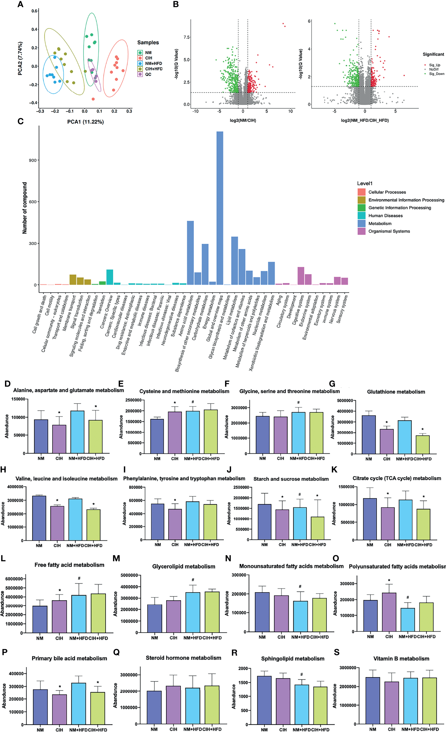 We detected 16,493 peaks (Table S1) in the positive and negative ionization modes, likely induced by CIH. After excluding the natural isotopic peaks, 320 and 516 metabolites (Supplementary Table S3) were identified in the positive and negative modes, respectively, including amino acids, carbohydrates, lipid molecules, bile acids (BA), fatty acids and vitamins. Unsupervised principal component analysis (PCA) analysis was used to evaluate the intrinsic metabolic variations. Metabolites from the CIH group were more separated than those from the NM control group. However, metabolites from the CIH+HFD group showed less obvious separation than those from the NM+HFD group, indicating more significant metabolic differences between the CIH and NM groups (Figure 6A). Tight clustering of the QC samples indicated good reproducibility across samples. Volcano plots (Figure 6B) were constructed to evaluate the differential metabolites between the NM and CIH groups, and between the NM+HFD and CIH+HFD groups. The statistical significance level in the clustering analysis was a false discovery rate < 0.05 (> 4/3- or < 3/4-fold change).
