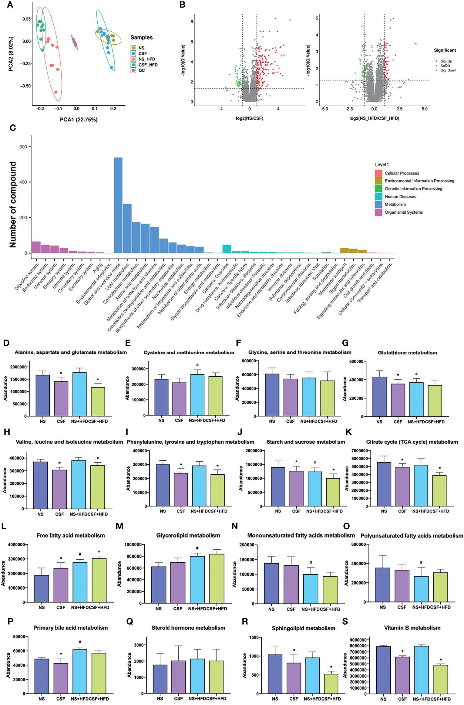 Effects of CSF on the serum metabolome. (A) The PCA plot of metabolites generated by using the metabolite intensity from the NS (n = 9), CSF (n = 9), NS+HFD (n = 9), and CSF+HFD (n = 9) groups. (B) Volcano plots of metabolites with FDR < 0.05 and fold changes of > 4/3 or < 3/4 when comparing NS vs CSF, or comparing NS+HFD vs CSF+HFD. (C) Enrichment of activated pathways induced by alterations of metabolites in NS, CSF, NS+HFD and CSF+HFD groups. (D–S) The abundance of metabolite pathways from the NS, CSF, NS+HFD and CSF+HFD groups. Data are expressed as mean ± SEM. Group differences were assessed by using the Mann‐Whitney U test. *P < 0.05 when comparing NS vs CSF, or NS+HFD vs CSF+HFD, #P < 0.05 when comparing NS vs NS+HFD.