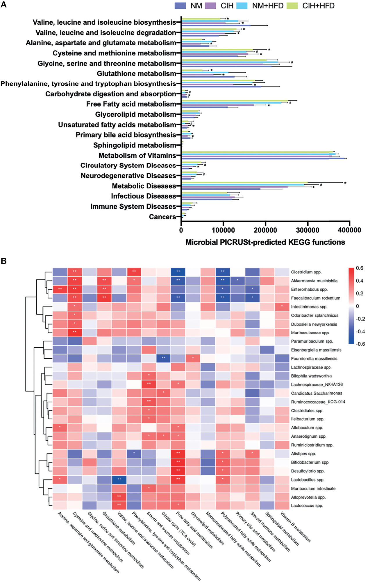 CIH-related fecal microbiota functional changes and correlations between the host metabolome and fecal microbiome. (A) Microbial PICRUSt‐predicted KEGG functions relevant to metabolism and diseases. Data are expressed as mean ± SEM. Group differences were assessed by using the Mann‐Whitney U test. *P < 0.05 when comparing NM vs CIH, or NM+HFD vs CIH+HFD. #P < 0.05 when comparing NM vs NM+HFD. (B) Spearman correlations of the relative abundance of fecal microbial genus or species and the abundance of metabolite pathways in host serum (n = 36). The r values are represented by gradient colors, with red cells indicating positive correlations and blue cells indicating negative correlations. *P < 0.05, and **P < 0.01.