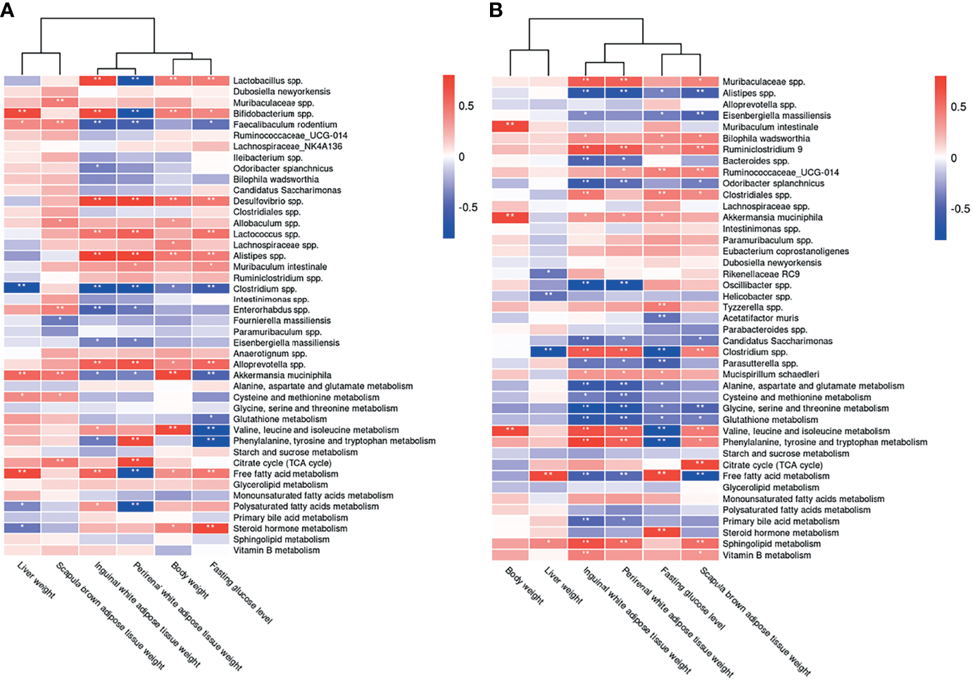 Correlations between the host metabolome, fecal microbiome and hepatic- and adipose- phenotype. (A) Spearman correlations of the relative abundance of fecal microbial genus or species, the abundance of metabolite pathways and phenotype of obesity and fasting glucose in host serum of 4 CIH-related modeling groups (n = 36). (B) Spearman correlations of the relative abundance of fecal microbial genus or species, the abundance of metabolite pathways and phenotype of obesity and fasting glucose in host serum of 4 PSD-related modeling groups (n = 36). The r values are represented by gradient colors, with red cells indicating positive correlations and blue cells indicating negative correlations. *P < 0.05, and **P < 0.01.