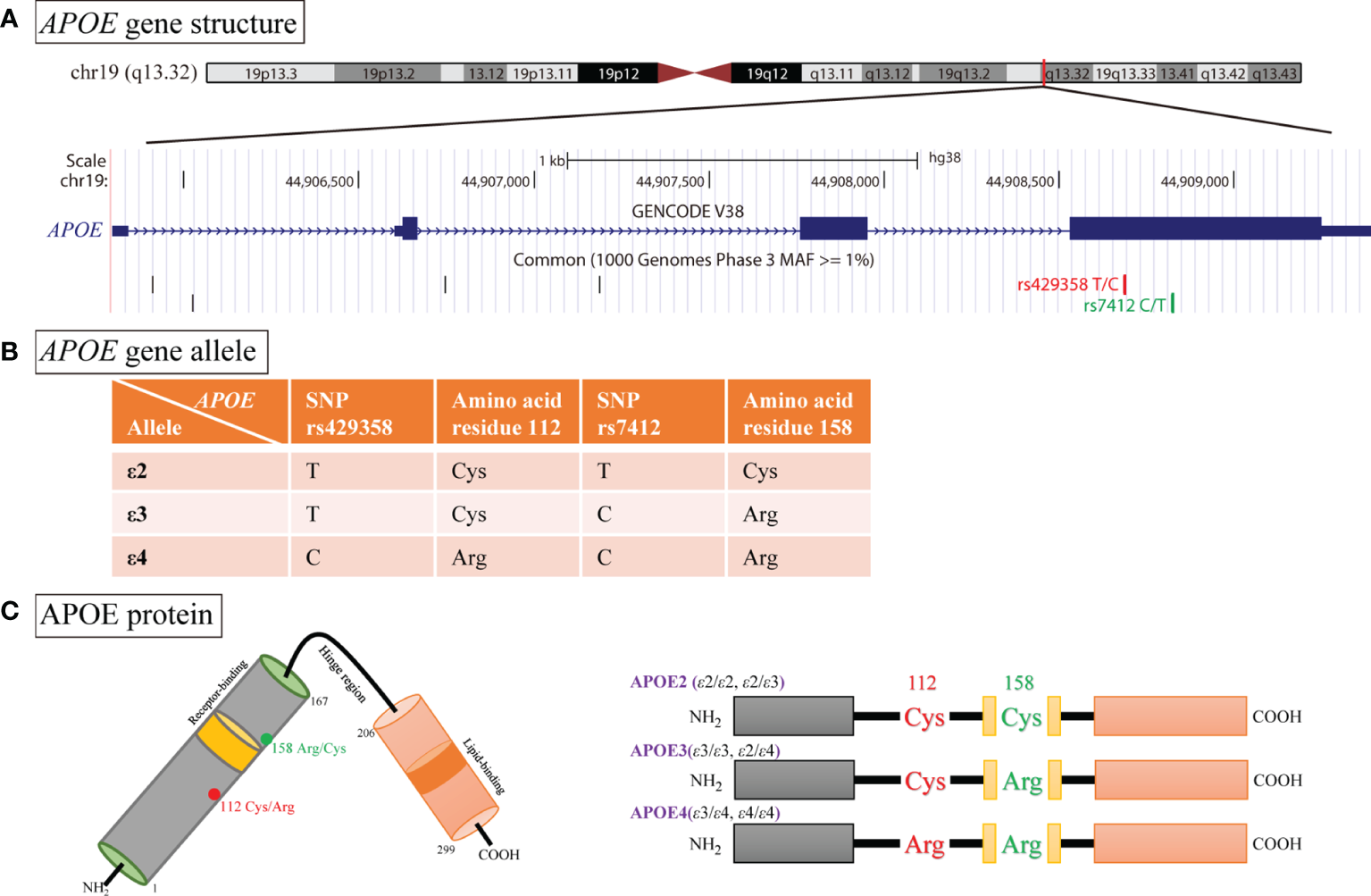 Schematic illustration of APOE genotype and APOE isoform. (A) Functional single nucleotide polymorphisms (SNPs) in the APOE gene viewed in UCSC genome browser. (B) Two SNPs (rs429358 and rs7412) in exon 4 of APOE generate three major allelic variants (ϵ2, ϵ3, and ϵ4). (C) APOE protein is a polypeptide chain with 299 amino, and the APOE2, APOE3, and APOE4 isoforms differ from one another at amino acid residues 112 or 158.