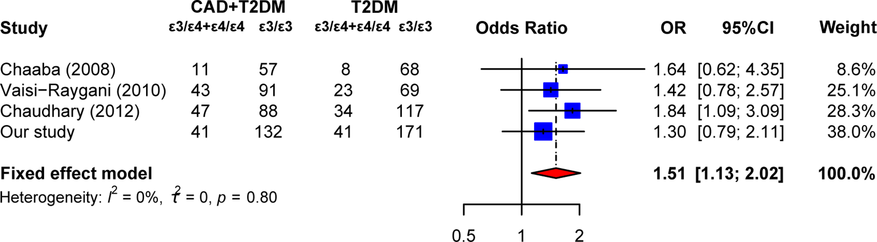 Genotype frequency ratio of genotype ϵ3/4 and allele ϵ4 among the CAD patients with or without T2DM was obviously increased. Compared with ϵ3/3 genotype, the ϵ3/4 genotype had a significant increased risk of CAD (adjusted OR = 1.90, 95% CI = 1.30–2.77) and T2DM+CAD (adjusted OR = 1.95, 95% CI = 1.24–3.08). In the meta-analysis, four studies were included and provided a strong evidence for the APOE ϵ4 mutation elevating the risk of CAD in patients with T2DM (ϵ3/ϵ4+ϵ4/ϵ4 vs. ϵ3/ϵ3, OR = 1.51, 95% CI = 1.13–2.02). In the T2DM group, the plasma levels of low-density lipoprotein cholesterol (LDL-C) showed significant difference among the three APOE isoforms. The high-density lipoprotein cholesterol (HDL-C) levels of CAD patients with ϵ4-bearing genotypes were lower than those with ϵ3/3 genotype.