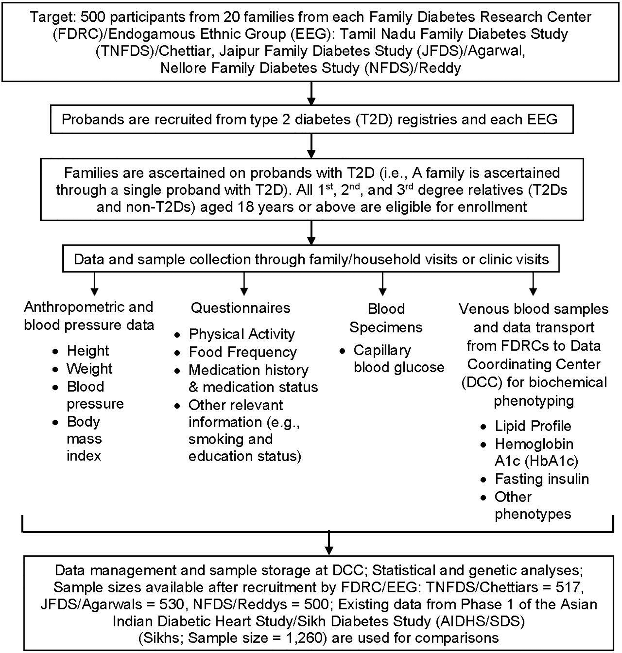 The study design was developed jointly by the Indian and US investigators. As part of the ICMR project, three independent Family Diabetes Research Centers (FDRCs), the Tamil Nadu Family Diabetes Study (TNFDS), Chennai, Tamil Nadu (South India); the Jaipur Family Diabetes Study (JFDS), Jaipur, Rajasthan (Northwest India); and the Nellore Family Diabetes Study (NFDS), Nellore, Andhra Pradesh (South India) were established. The FDRC at SRIHER, Chennai has served as the Data Coordinating Center (DCC). Each of the FDRCs recruitment goals were 500 individuals from ~20 large families; and the families were ascertained on probands that were previously identified as having T2D based on medical records or information from existing case registries available at the FDRCs. The study design and methodological tools used are summarized in Figure 1.