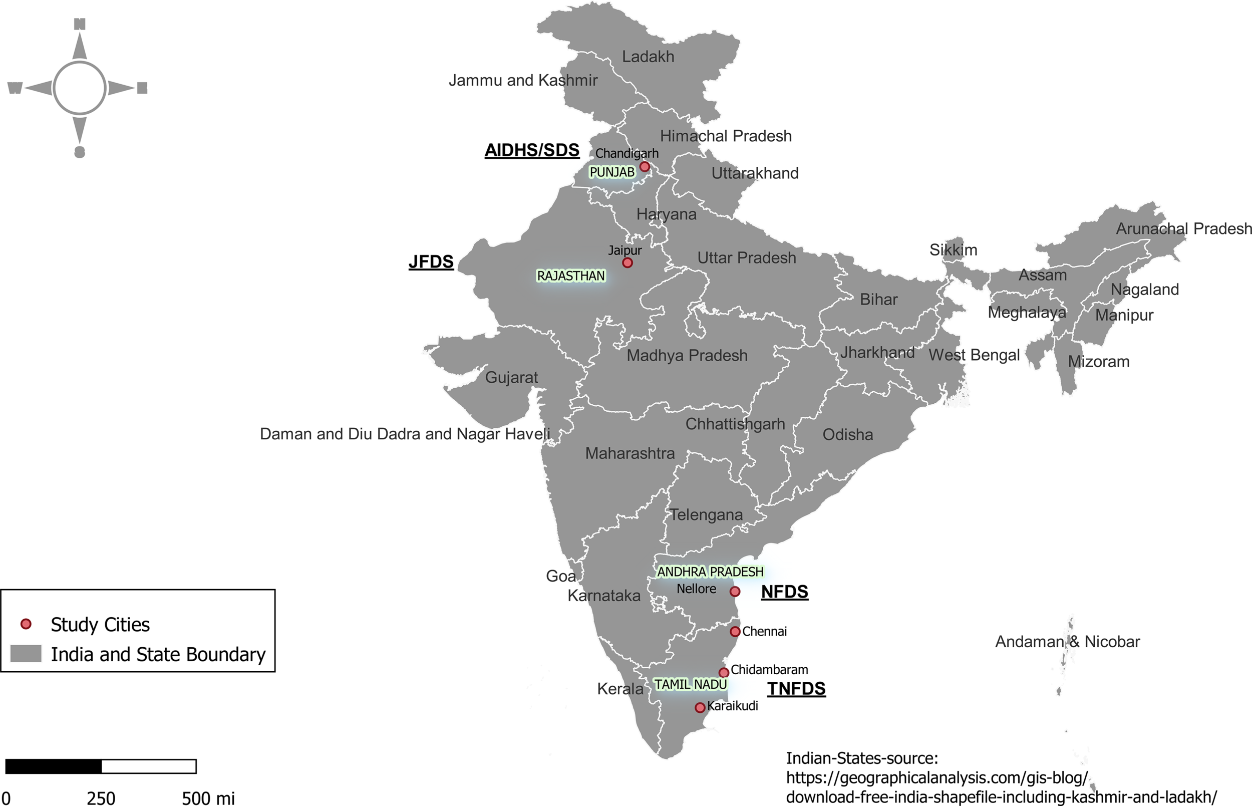 The geographic locations of the study sites in the states of Andhra Pradesh, Punjab, Rajasthan, and Tamil Nadu in India.