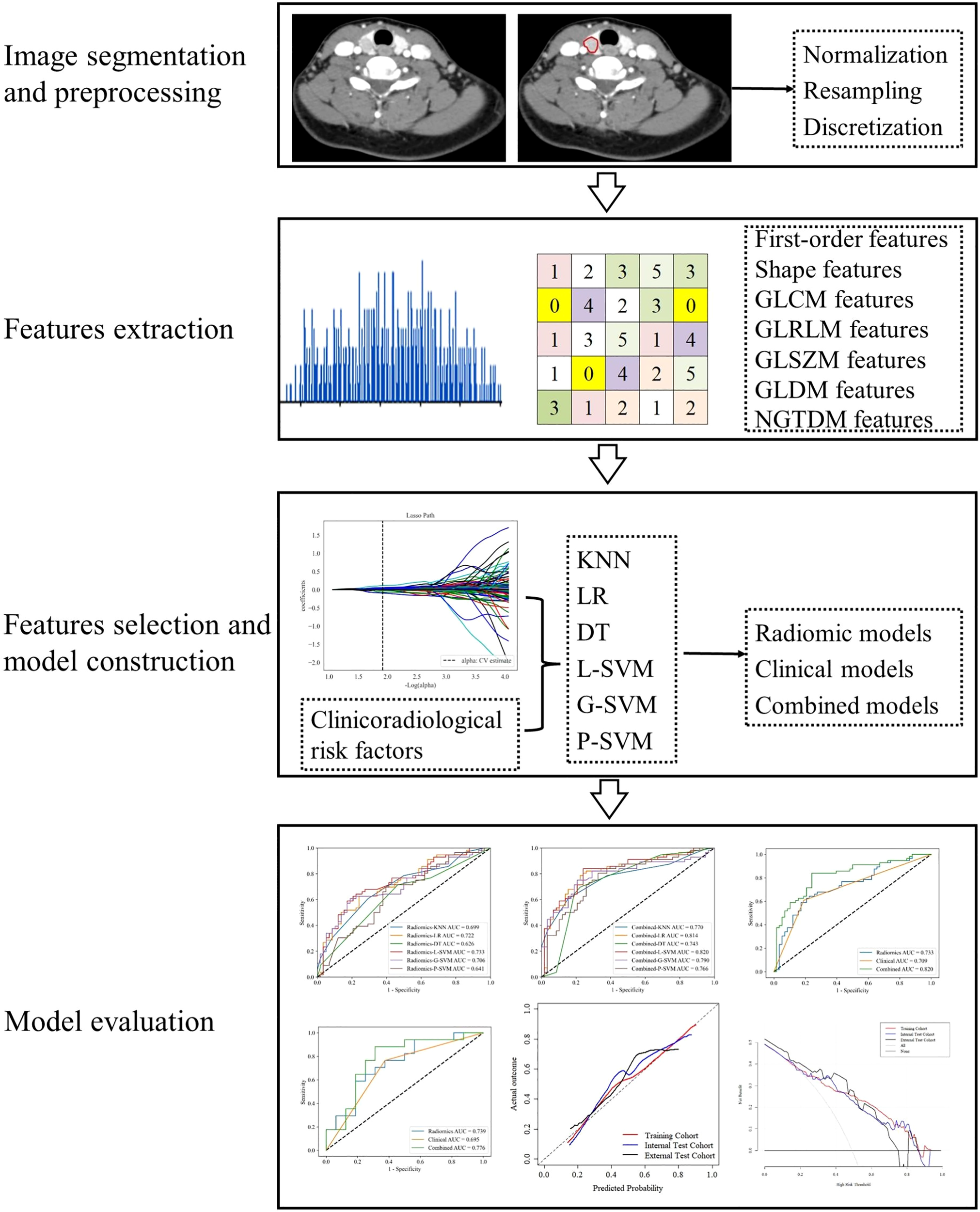 Workflow of data analysis. The workflow illustrates image segmentation and preprocessing, radiomics features extraction and selection, models construction and evaluation.