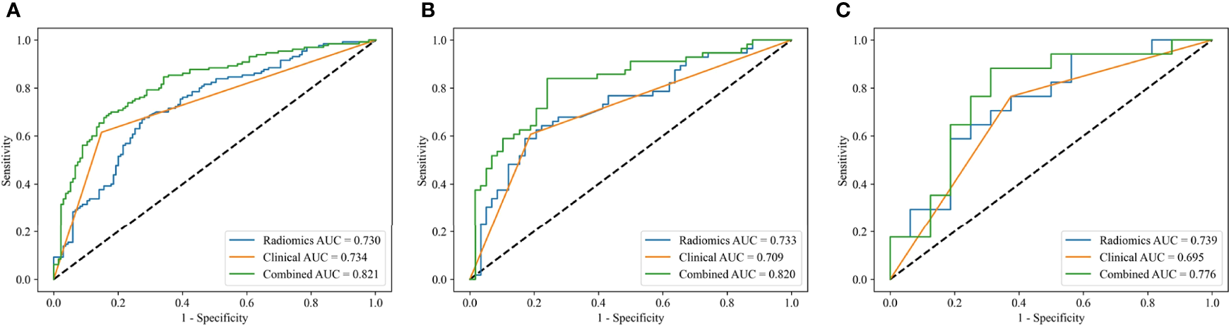 Radiomics models based on the optimal radiomics features alone were constructed. In the training cohort, radiomics-G-SVM model achieved the most satisfactory results with AUC 0.786 (95%CI 0.736–0.832). In the internal test cohort, radiomics-L-SVM model achieved the most satisfactory results with AUC 0.733 (95%CI 0.654–0.812) (Figures 4A, B).