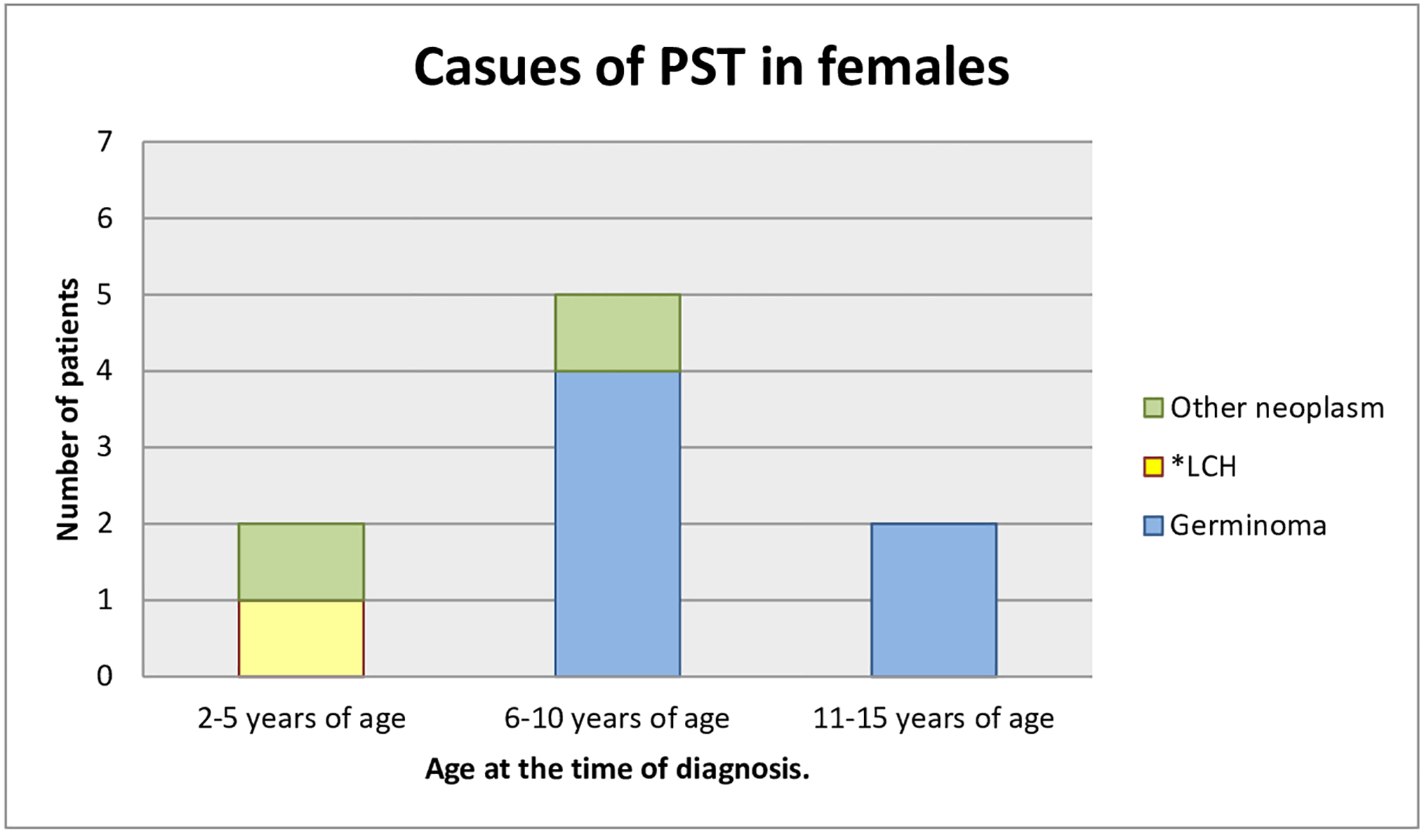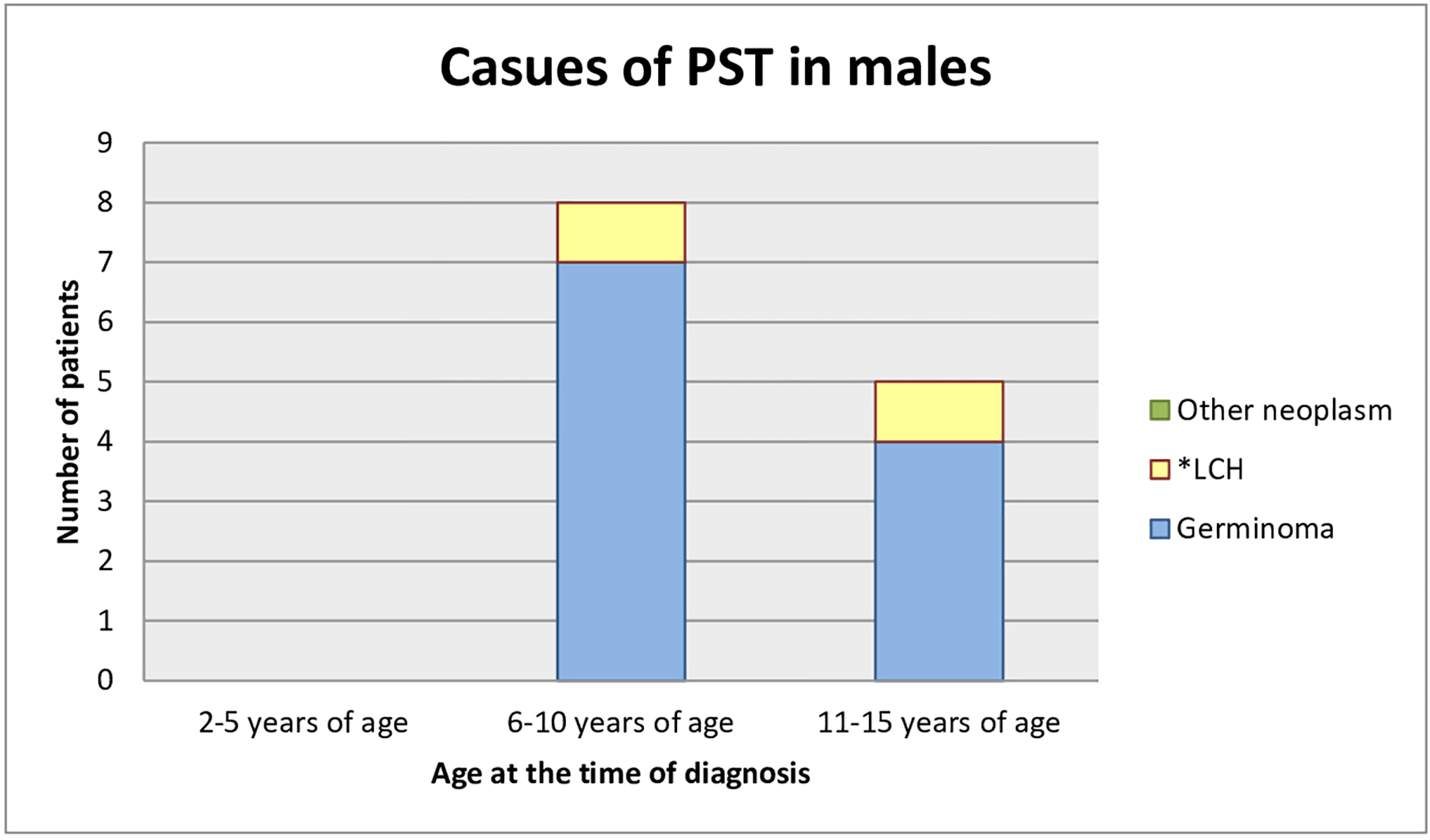 It is a study conducted in 23 patients (13 boys) with PST with/without central diabetes insipidus (CDI) diagnosed between 1990 and 2020 at Children’s Memorial Health Institute (CMHI) in Warsaw, Poland. We analyzed demographic data, clinical signs and symptoms, radiological findings, tumor markers, hormonal results, treatment protocols and outcomes.