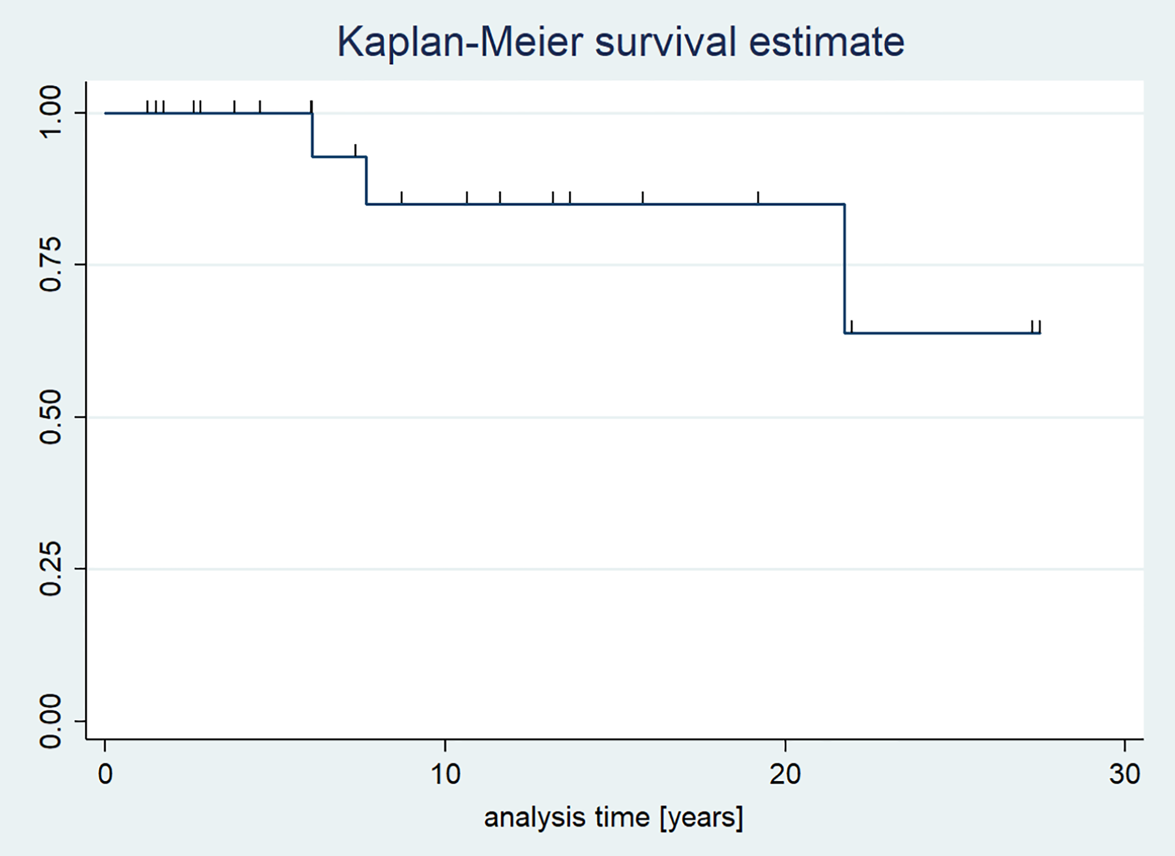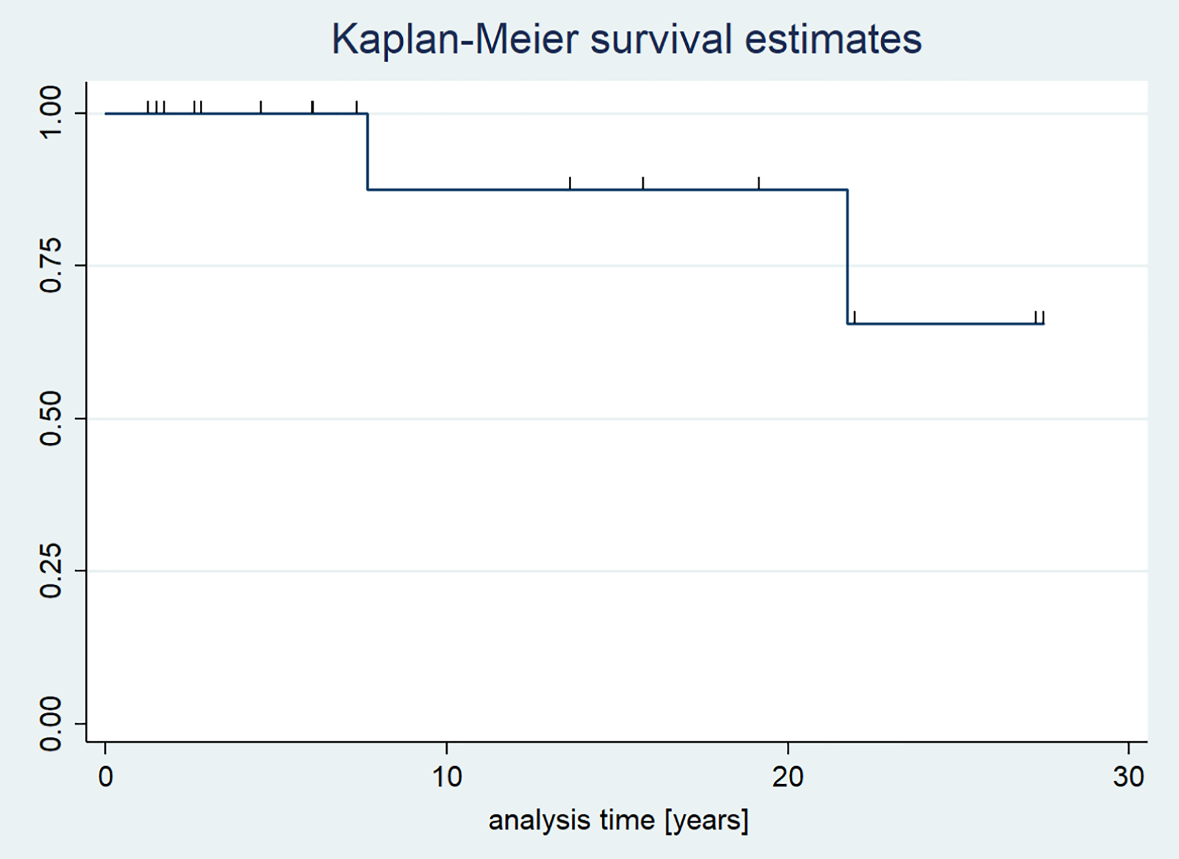 Statistical analyses were performed using Stata® Software ver. 14.1 (StataCorp LLC). Nominal parameters were presented as a percentage frequency. The Shapiro-Wilk test was used to test the univariate normality assumption of continuous variables. The Kaplan-Meier survival curves were used to assess the overall survival of the study population.