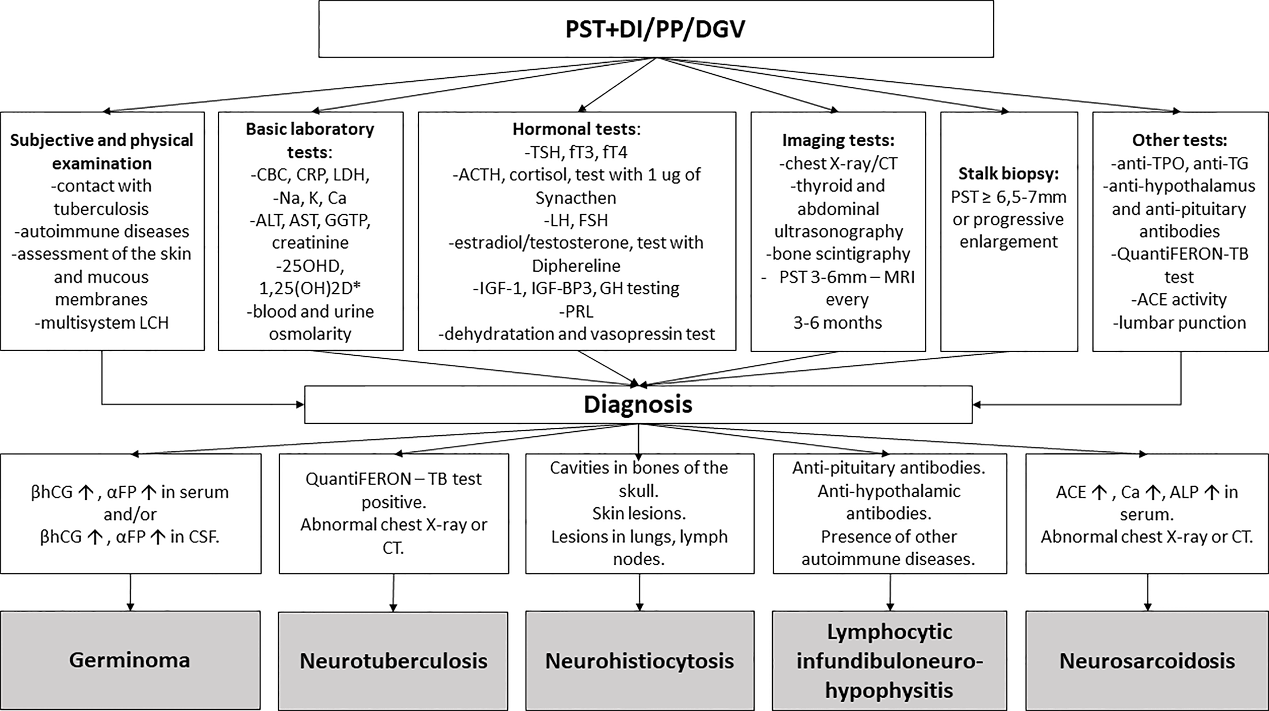 pituitary stalk thickening, diabetes insipidus, germinoma, histiocytosis, lymphocytic hypophysitis, sarcoidosis, children