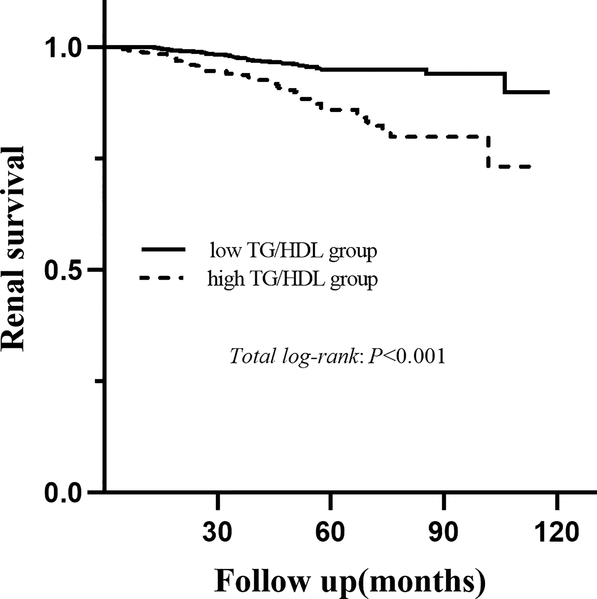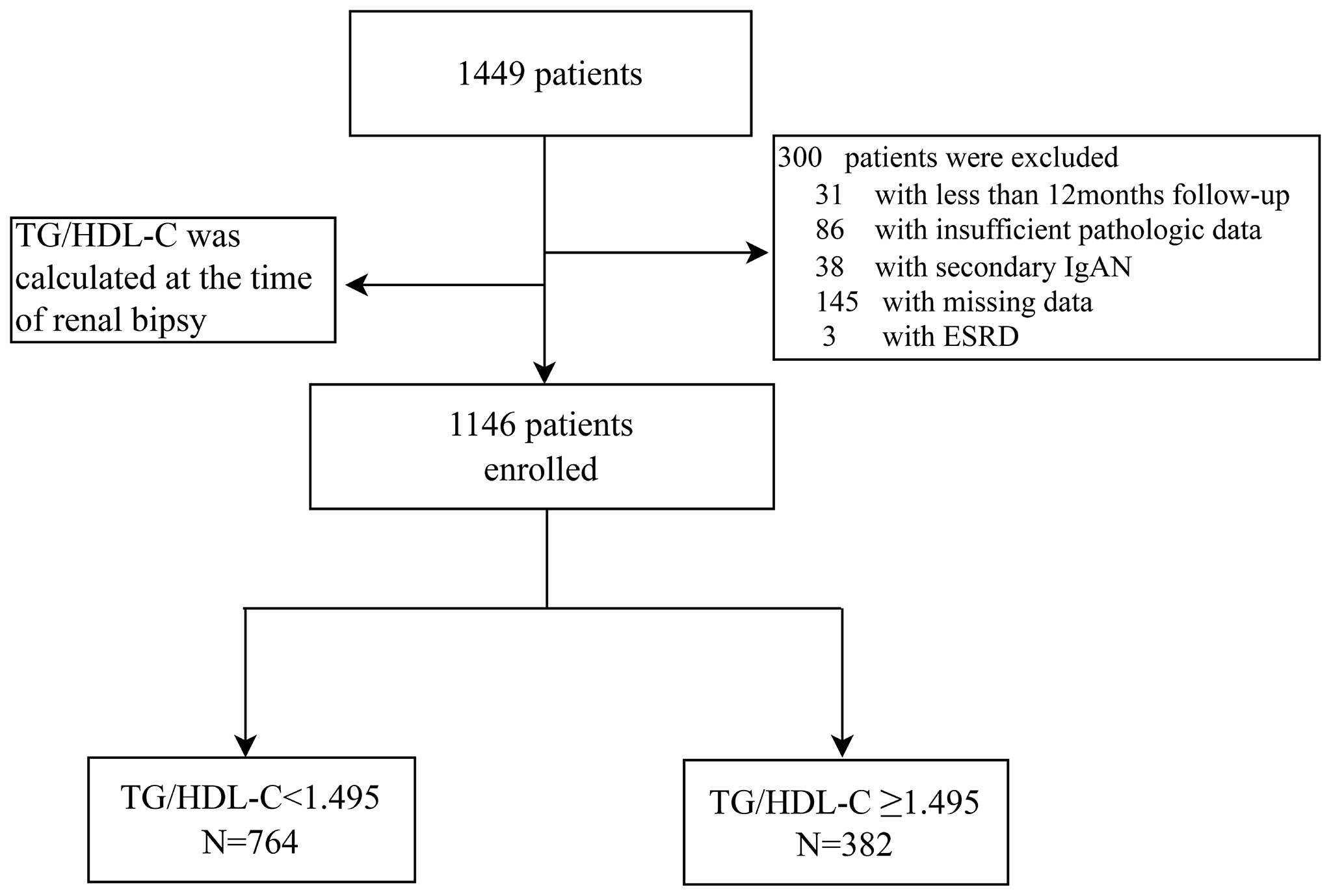 A total of 1146 patients from West China Hospital of Sichuan University were retrospectively analysed between 2008 and 2018.The demographic, clinical and pathological data of all patients at the time of biopsy were collected. Then, patients were divided into the high TG/HDL group (TG/HDL ≥ 1.495, N=382) and the low TG/HDL group (TG/HDL-C < 1.495, N=764) based on the optimal cut-off value of the TG/HDL-C using receive operating curve. Cox proportional hazard models and Kaplan–Meier curves were used to evaluate the renal outcomes of IgAN.