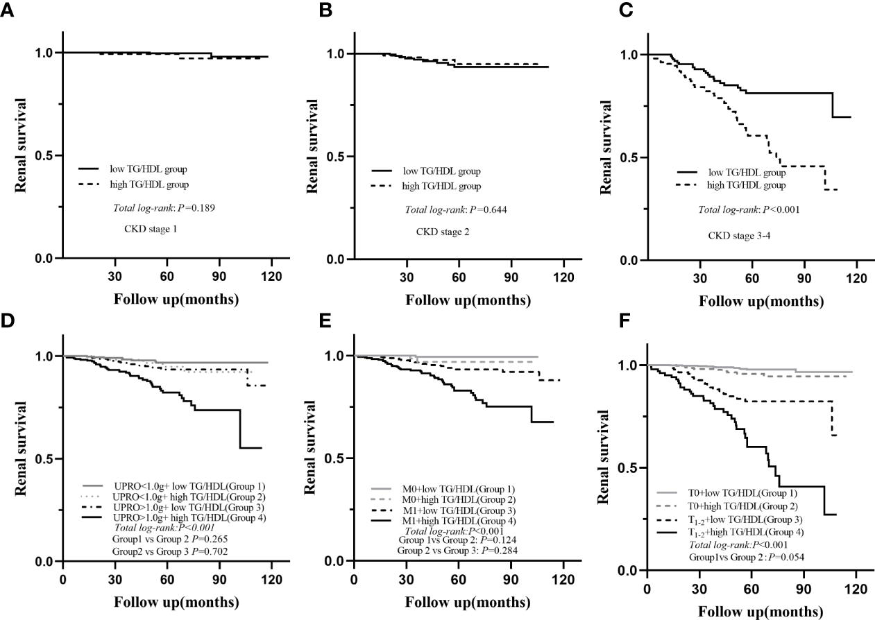 During a median follow-up period of 54.1 (35.6-73.2) months, a total of 78 (6.8%) patients developed ESRD. For renal survival, our results reveal that TG/HDL-C ≥1.495 was significantly associated with ESRD (Figure 2, P < 0.001). Subgroup analysis of mesangial hypercellularity and tubular atrophy/interstitial fibrosis, CKD stages and proteinuria for ESRD by Kaplan–Meier analysis is shown in Figure 3. Our results indicated that a high TG/HDL-C ratio was a risk factor for ESRD in patients with IgAN, especially patients with eGFR<60 mL/min/1.73 m2 (P<0.001) (Figures 3A–C), 24-hour urine protein ≥1 g/day (P< 0.001) (Figure 3D), or mesangial hypercellularity and tubular atrophy/interstitial fibrosis (Figures 3E, F) in pathologic lesions.