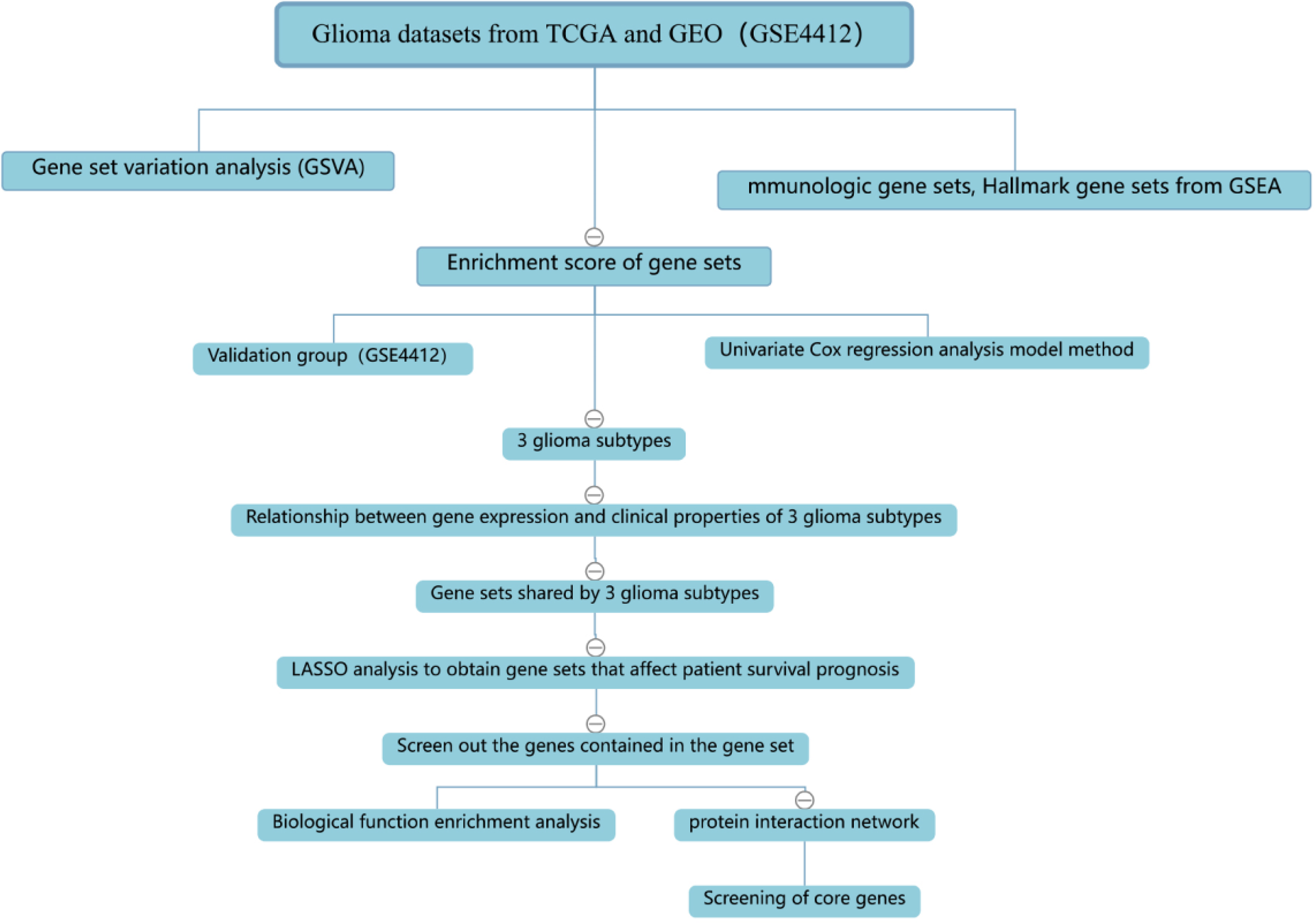 Because GSVA can detect even subtle pathway activity, we use GSVA to detect pathway activity in selected sets of genes. We downloaded 4922 immunologically relevant genes from GSEA to provide a comprehensive picture of the changes in the immune activity of glioma. gene expression of glioma was downloaded from the TCGA database (from 508 glioma patients) and GEO (GSE4412, 85 glioma patients).