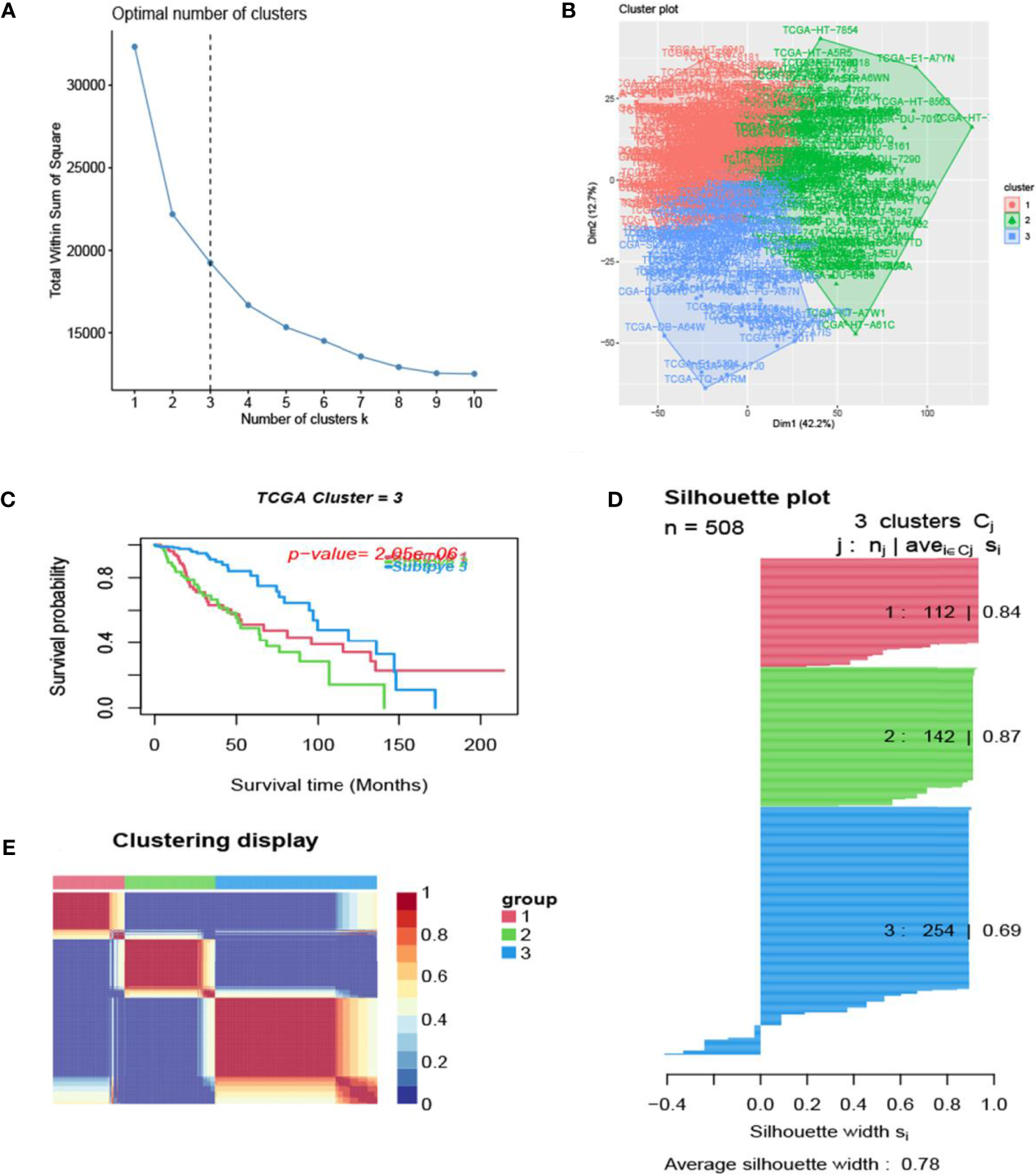 Glioma subtype identification (TCGA). (A) Use the factoextra package to perform clusters analysis. (B) Sample composition diagram of the 3 cancer subtypes. (C) K-M curves of different cancer subtypes. (D) Cancer Subtypes’ Silhouette width plots. (E) The clustering displays of the three cancer subtypes.
