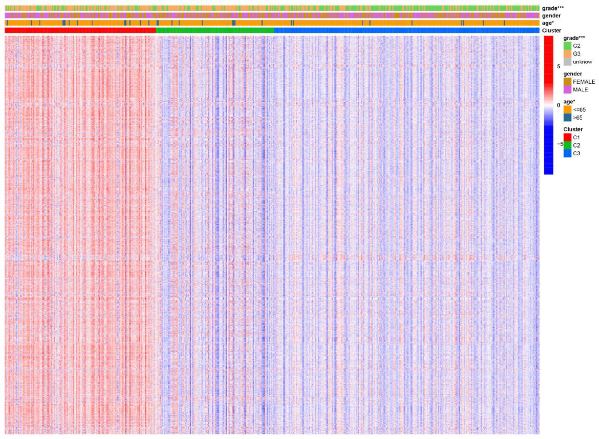 Heat map of the relationship between the expression of gene sets affecting patient survival prognosis, and individual clinically relevant information. * means P<0.05, and *** means P<0.001.
