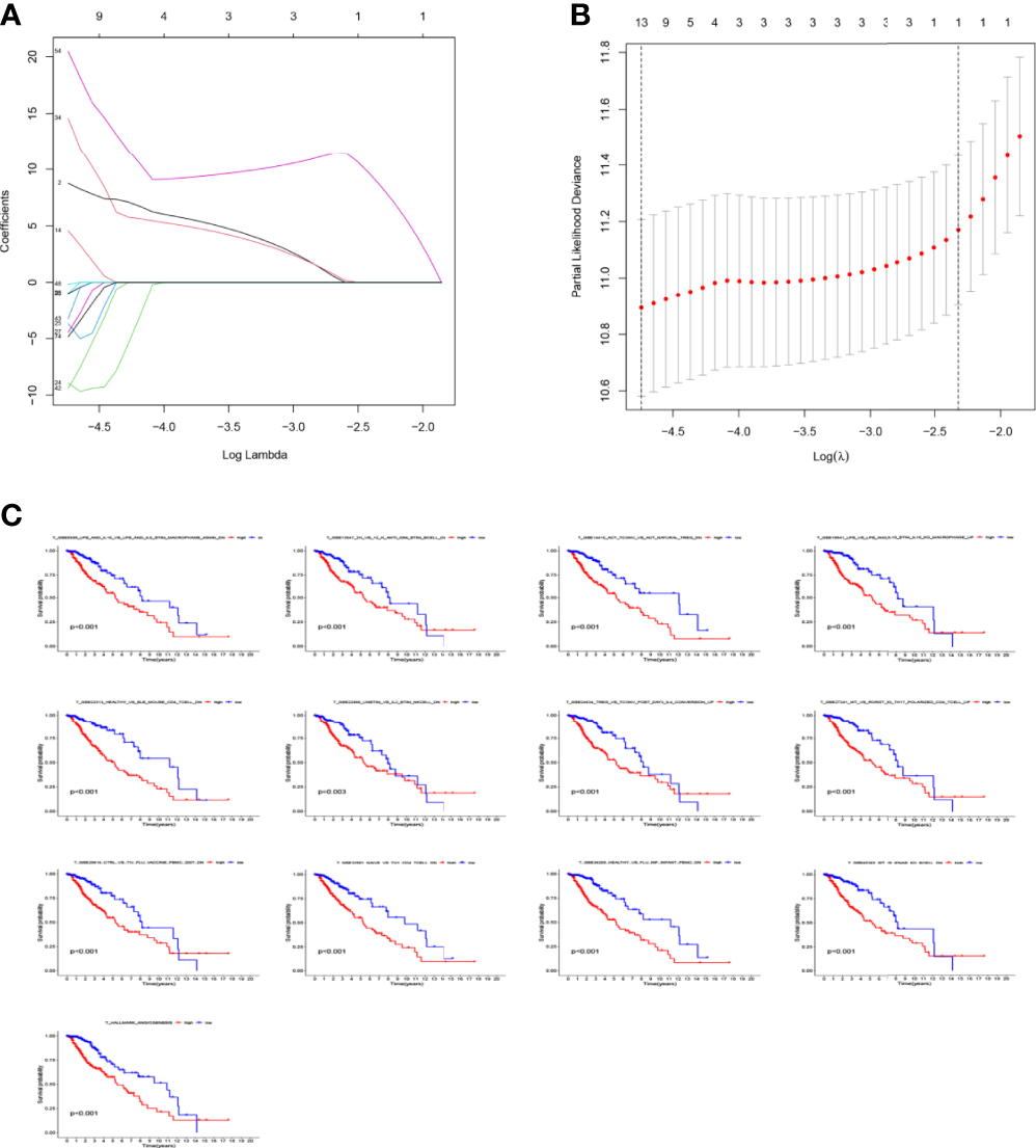 Results of LASSO analysis regarding 13 gene sets affecting the survival prognosis of glioma patients.