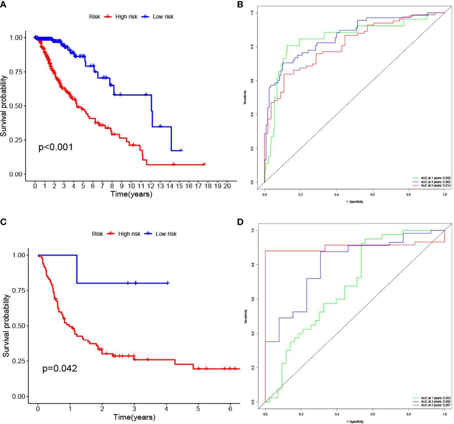 High risk score among glioma patients were associated with low overall survival (p-value < 0.05 was considered statistically significant). The AUC (Area Under roc Curve) value of ROC indicates that 0.5-0.7 is acceptable, 0.7-0.9 is good, and> 0.9 is excellent. (A) K-M curves of the glioma (TCGA) risk score model. (B) glioma (TCGA) ROC curve. (C) K-M curves of the glioma (GEO GSE4412) risk score model. (D) glioma (GEO GSE4412) ROC curve.