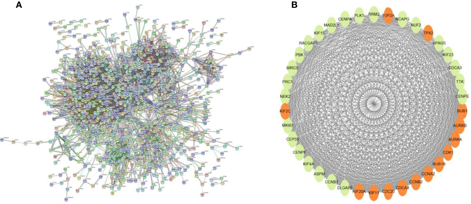 (A) PPI network diagram of 13 sets of genes. (B) The 14 core gene networks are related to 13 gene sets, namely: TOP2A, TPX2, BUB1, AURKB, AURKA, CDK1, BUB1B, CCNA2, CCNB2, CDCA8, CDC20, KIF11, KIF20A and KIF2C.