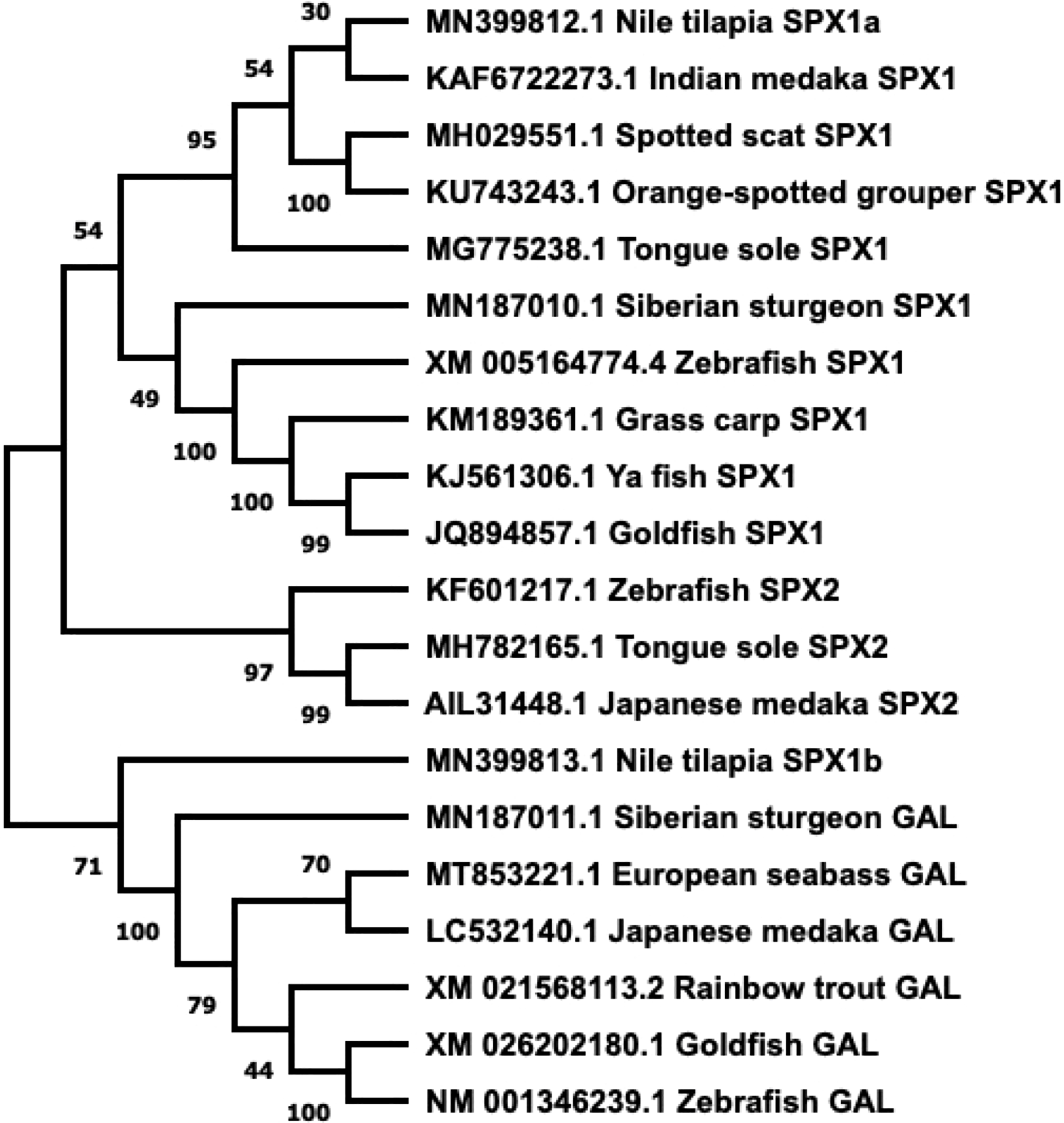 Phylogenetic tree of SPX and GAL present in fish. Sequences obtained from GenBank. Phylogenetic construction was done in MEGA X, using the Neighbor-Joining method. The percentage of the sequences clustered together is shown on the branches, out of 1000. SPX and GAL form two distinct branches, with SPX1 and SPX2 dividing further.