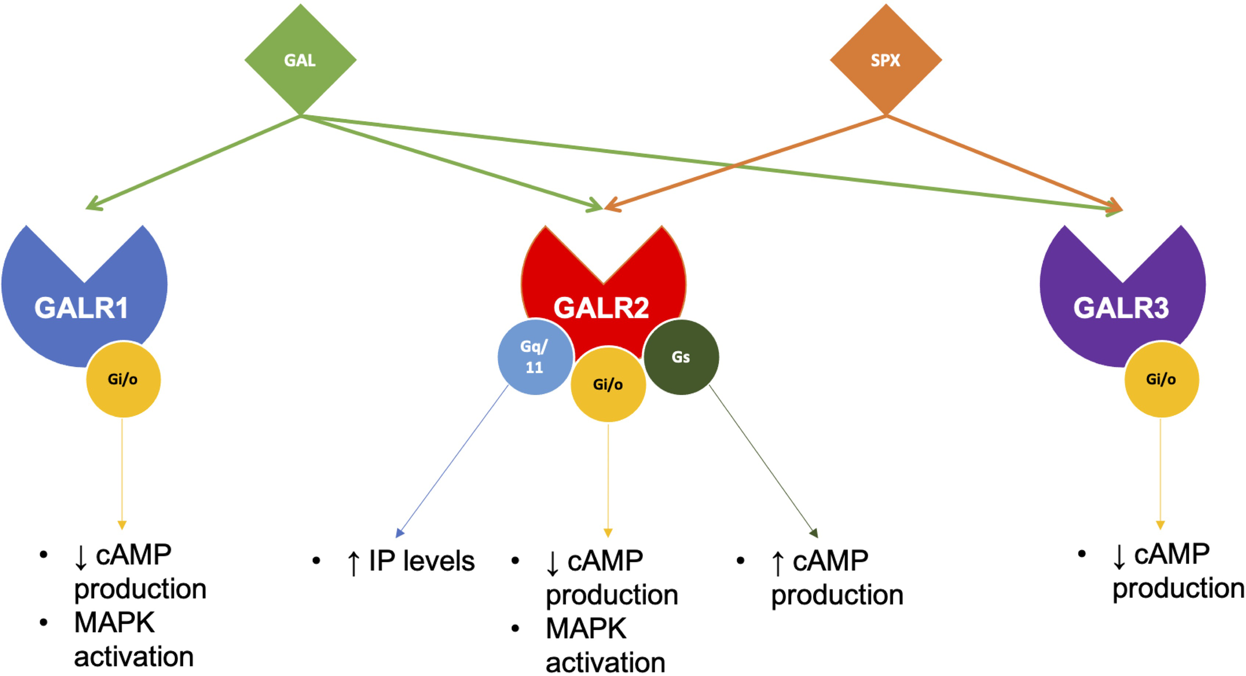 Galanin receptors pair with different G-proteins to execute SPX or GAL functions. In brief, GAL acts on all three of its receptors, while SPX only pairs with GALR2 and GALR3. Although both GALR1 and GALR3 can only pair with Gi/o proteins, GALR2 has been found to pair with several G-proteins, mediating various downstream effects.